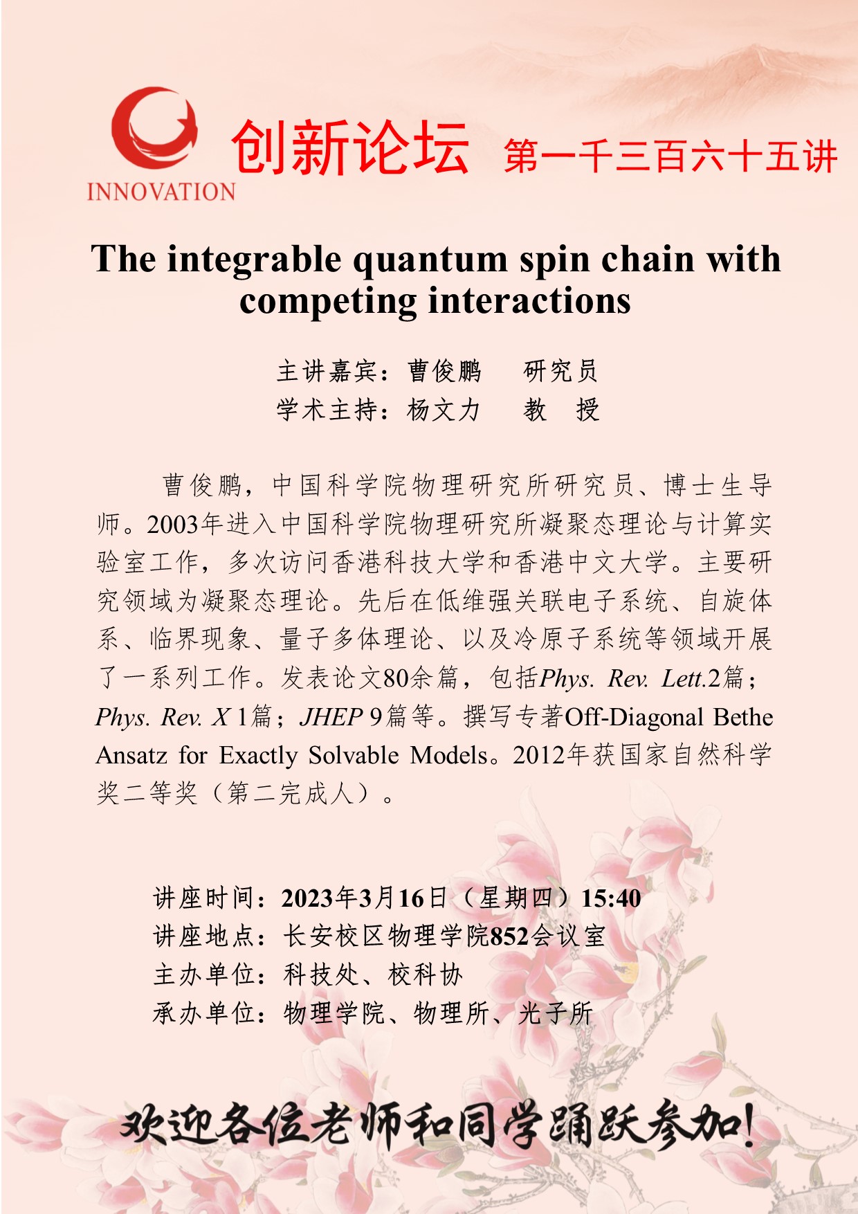 曹俊鹏 研究员 星空app官网创新论坛第一千三百六十五讲:The integrable quantum spin chain with competing interactions 讲座时间 2023年3月16日(星期四)15:40 讲座地点 长安校区物理学院852会议室 讲座人介绍 曹俊鹏 研究员 讲座内容