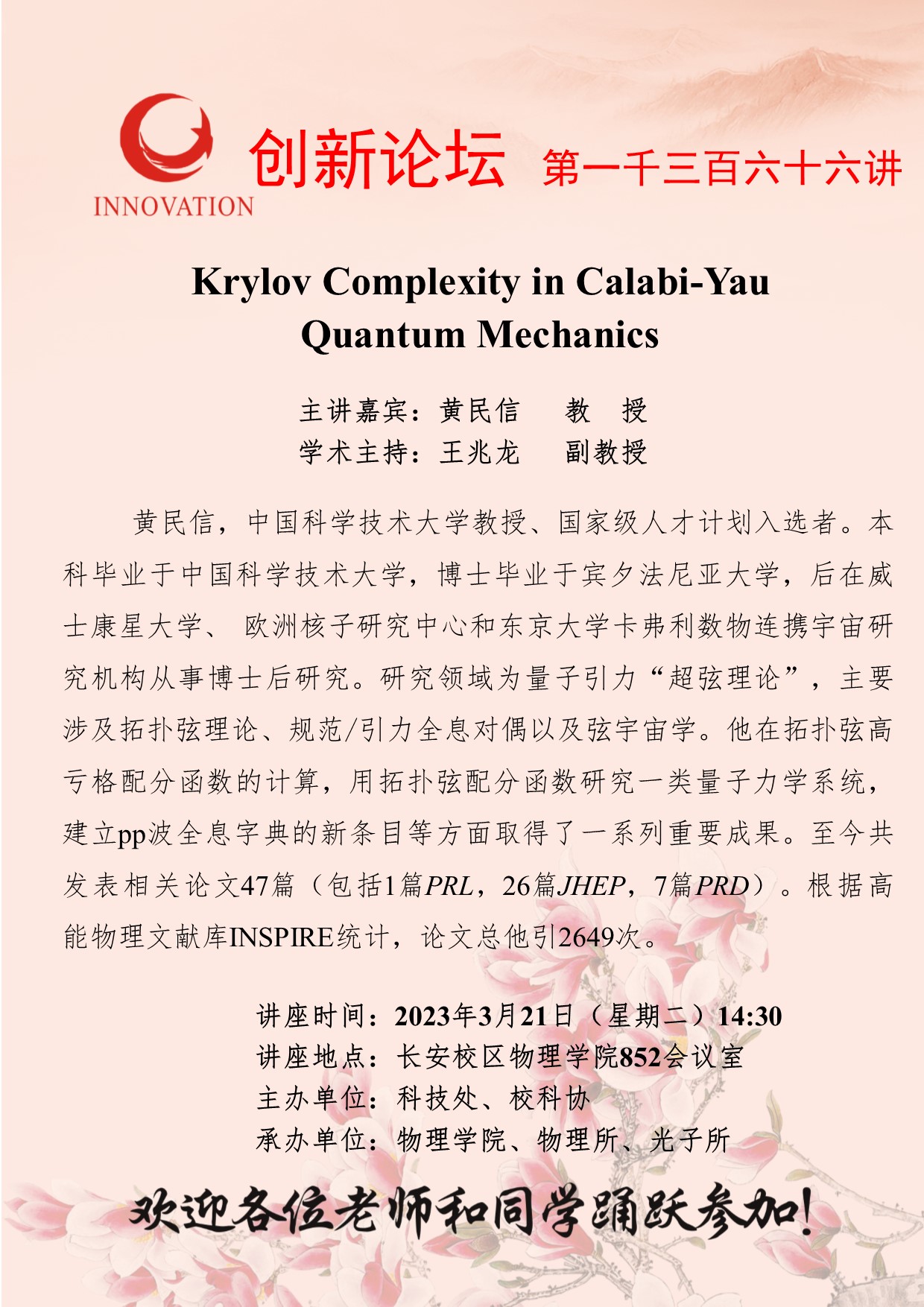 黄民信 教授 星空app官网创新论坛第一千三百六十六讲:Krylov Complexity in Calabi-Yau Quantum Mechanics 讲座时间 2023年3月21日(星期二)14:30 讲座地点 长安校区物理学院852会议室 讲座人介绍 黄民信 教授 讲座内容