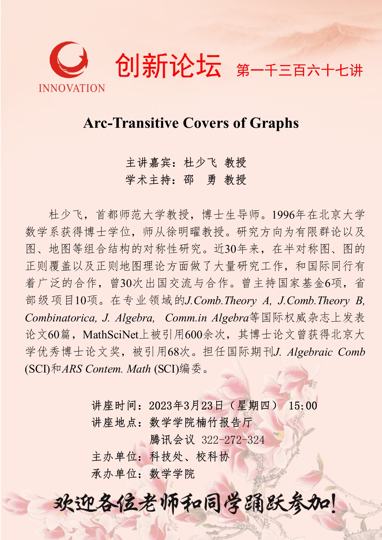 杜少飞 教授 星空app官网创新论坛第一千三百六十七讲:Arc-Transitive Covers of Graphs 讲座时间 2023年3月23日(星期四) 15:00 讲座地点 数学学院楠竹报告厅、腾讯会议 322-272-324 讲座人介绍 杜少飞 教授 讲座内容