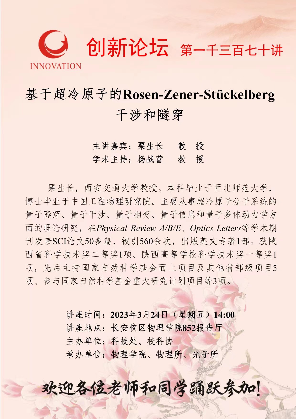 栗生长 教 授 星空app官网创新论坛第一千三百七十讲:基于超冷原子的Rosen-Zener-Stückelberg干涉和隧穿 讲座时间 2023年3月24日(星期五)14:00 讲座地点 长安校区物理学院852报告厅 讲座人介绍 栗生长 教 授 讲座内容