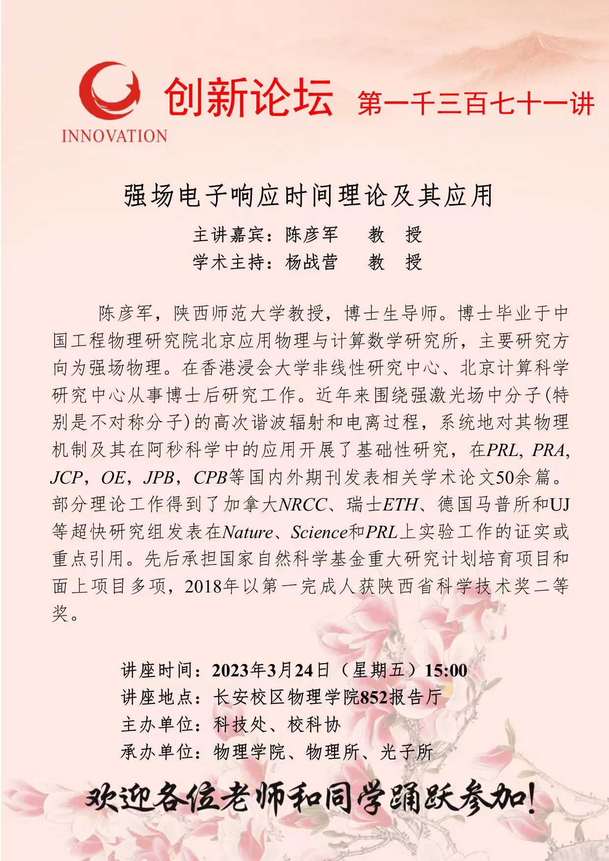 陈彦军 教 授 星空app官网创新论坛第一千三百七十一讲:强场电子响应时间理论及其应用 讲座时间 2023年3月24日(星期五)15:00 讲座地点 长安校区物理学院852报告厅 讲座人介绍 陈彦军 教 授 讲座内容