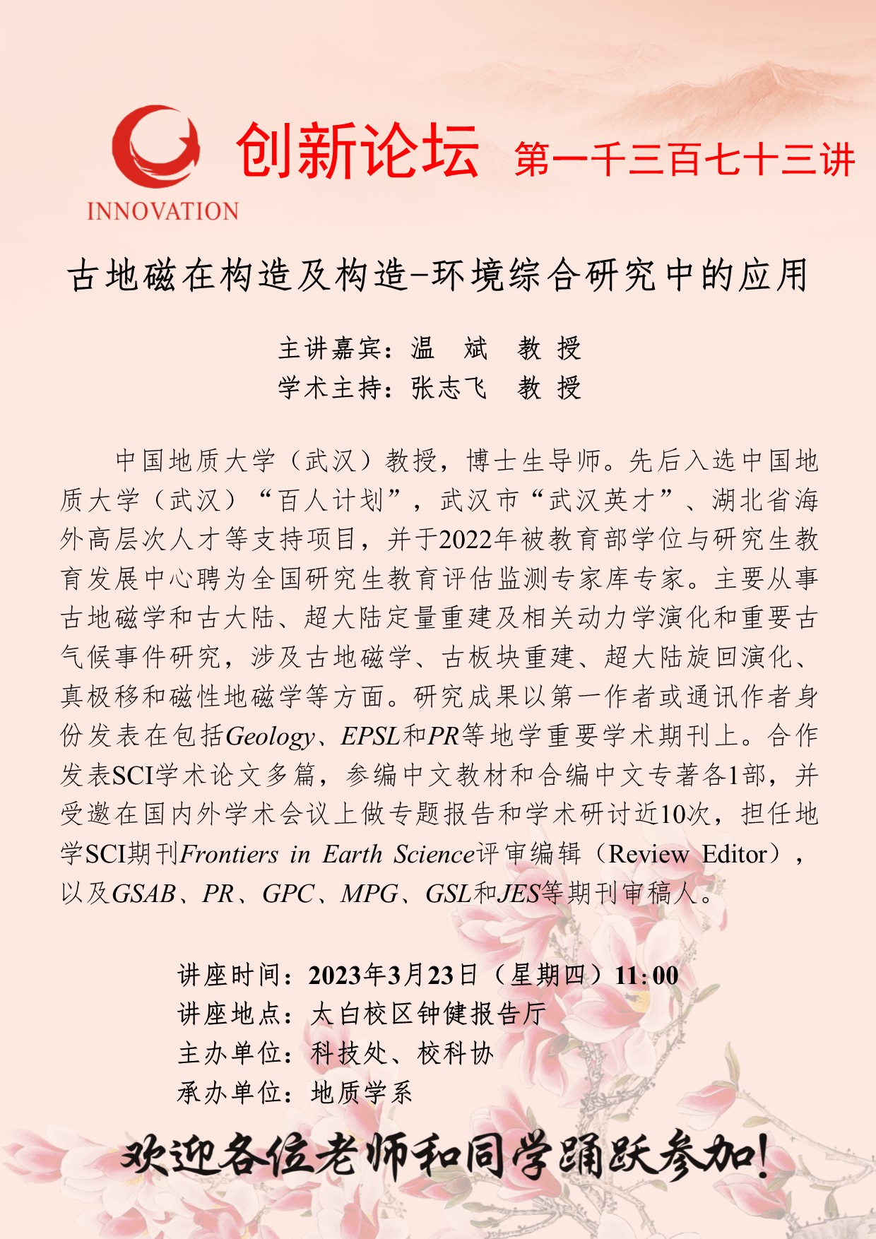 温斌 教授 星空app官网创新论坛第一千三百七十三讲:古地磁在构造及构造-环境综合研究中的应用 讲座时间 2023年3月23日(星期四)11:00 讲座地点 太白校区钟健报告厅 讲座人介绍 温斌 教授 讲座内容