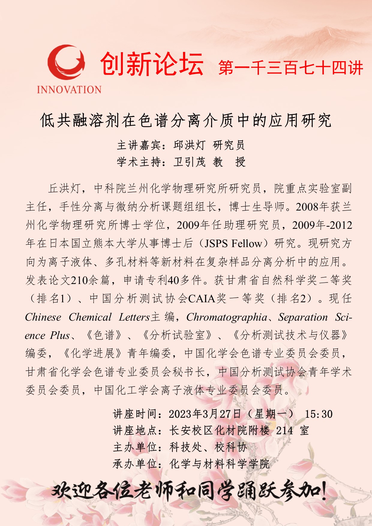 邱洪灯 研究员 星空app官网创新论坛第一千三百七十四讲:低共融溶剂在色谱分离介质中的应用研究 讲座时间 2023年3月27日(星期一) 15:30 讲座地点 长安校区化材院附楼214室 讲座人介绍 邱洪灯 研究员 讲座内容