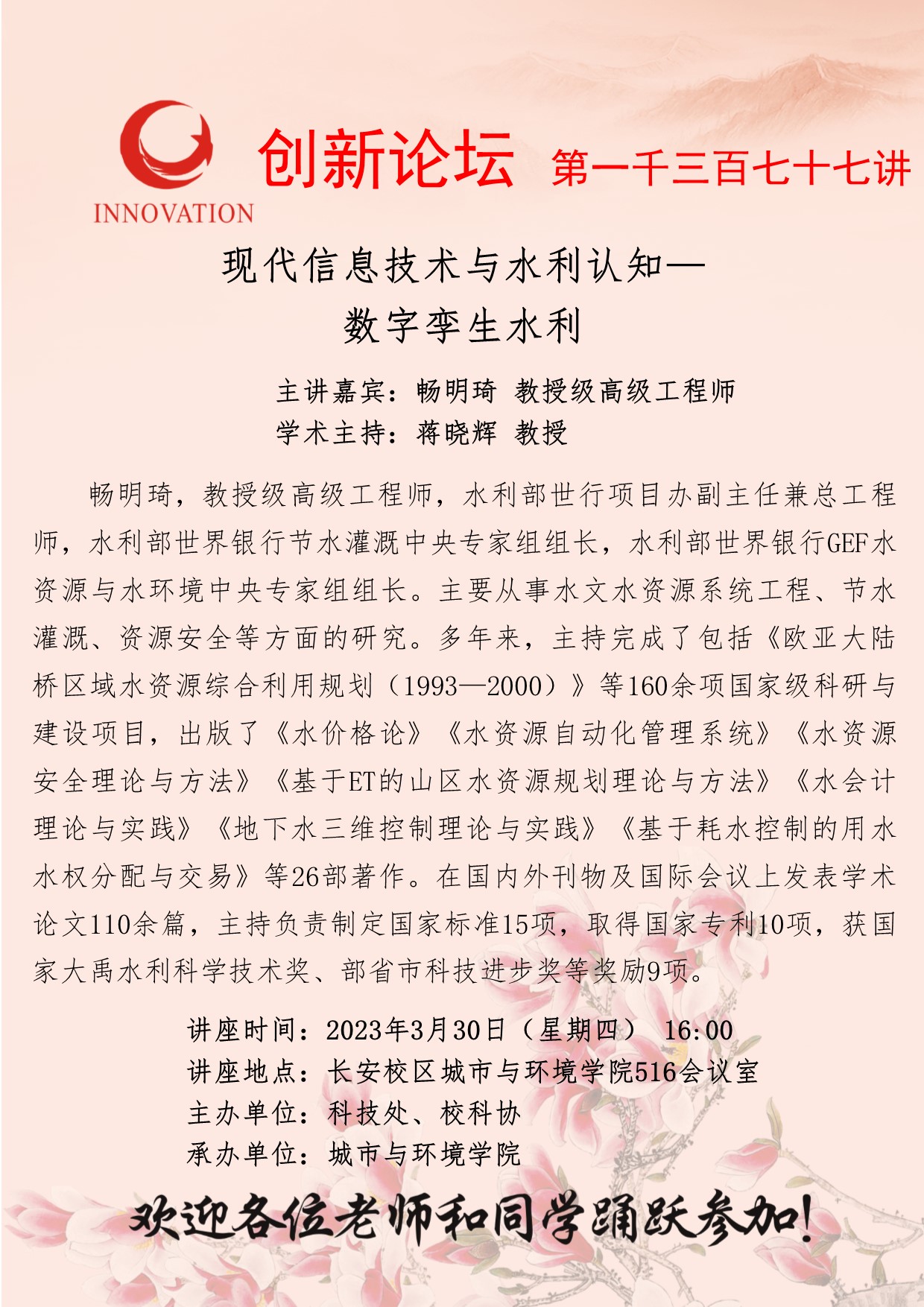 畅明琦 教授级高级工程师 星空app官网创新论坛第一千三百七十七讲:现代信息技术与水利认知—数字孪生水利 讲座时间 2023年3月30日(星期四) 16:00 讲座地点 长安校区城市与环境学院516会议室 讲座人介绍 畅明琦 教授级高级工程师 讲座内容