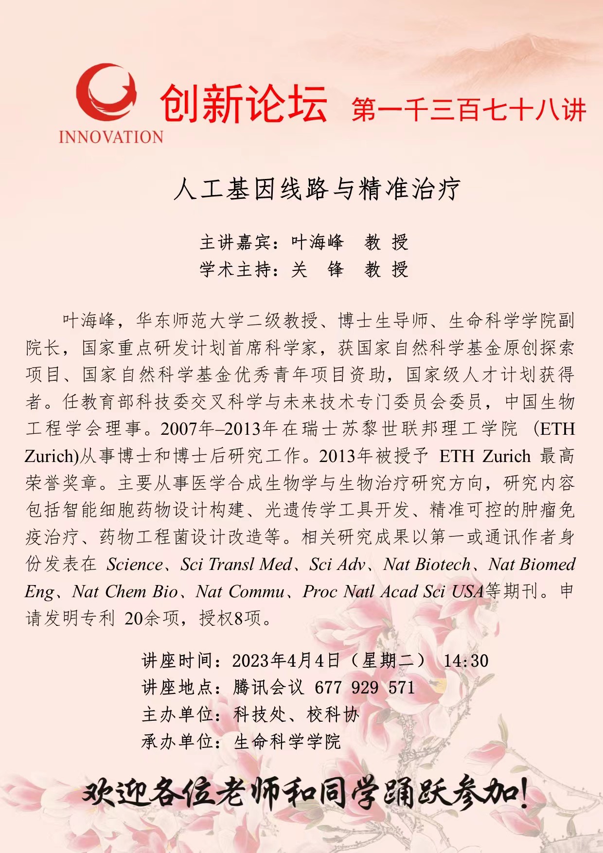 叶海峰 教授 星空app官网创新论坛第一千三百七十八讲:人工基因线路与精准治疗 讲座时间 2023年4月4日(星期二) 14:30 讲座地点 腾讯会议 677 929 571 讲座人介绍 叶海峰 教授 讲座内容