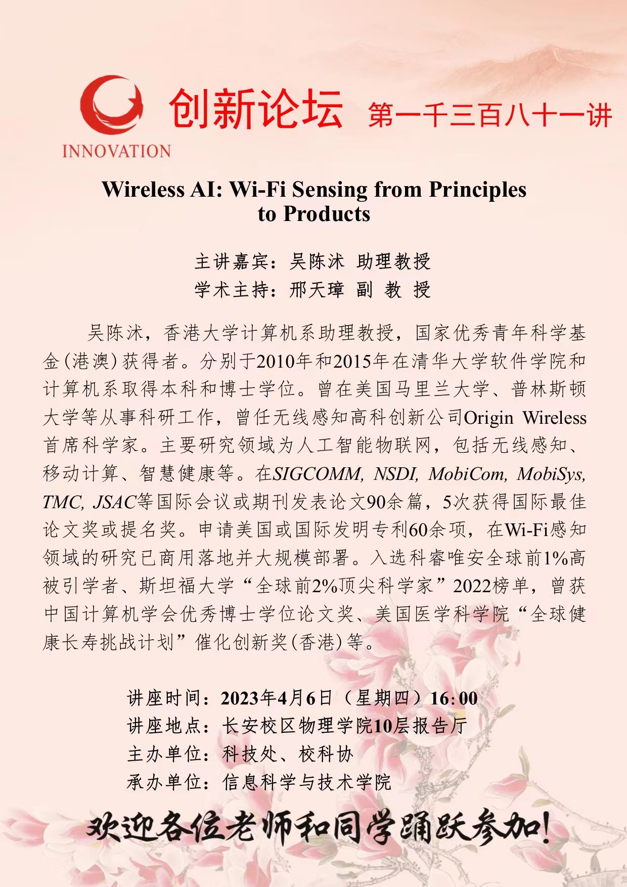 吴陈沭 助理教授 星空app官网创新论坛第一千三百八十一讲:Wireless AI: Wi-Fi Sensing from Principles to Products 讲座时间 2023年4月6日(星期四)16:00 讲座地点 长安校区物理学院10层报告厅 讲座人介绍 吴陈沭 助理教授 讲座内容