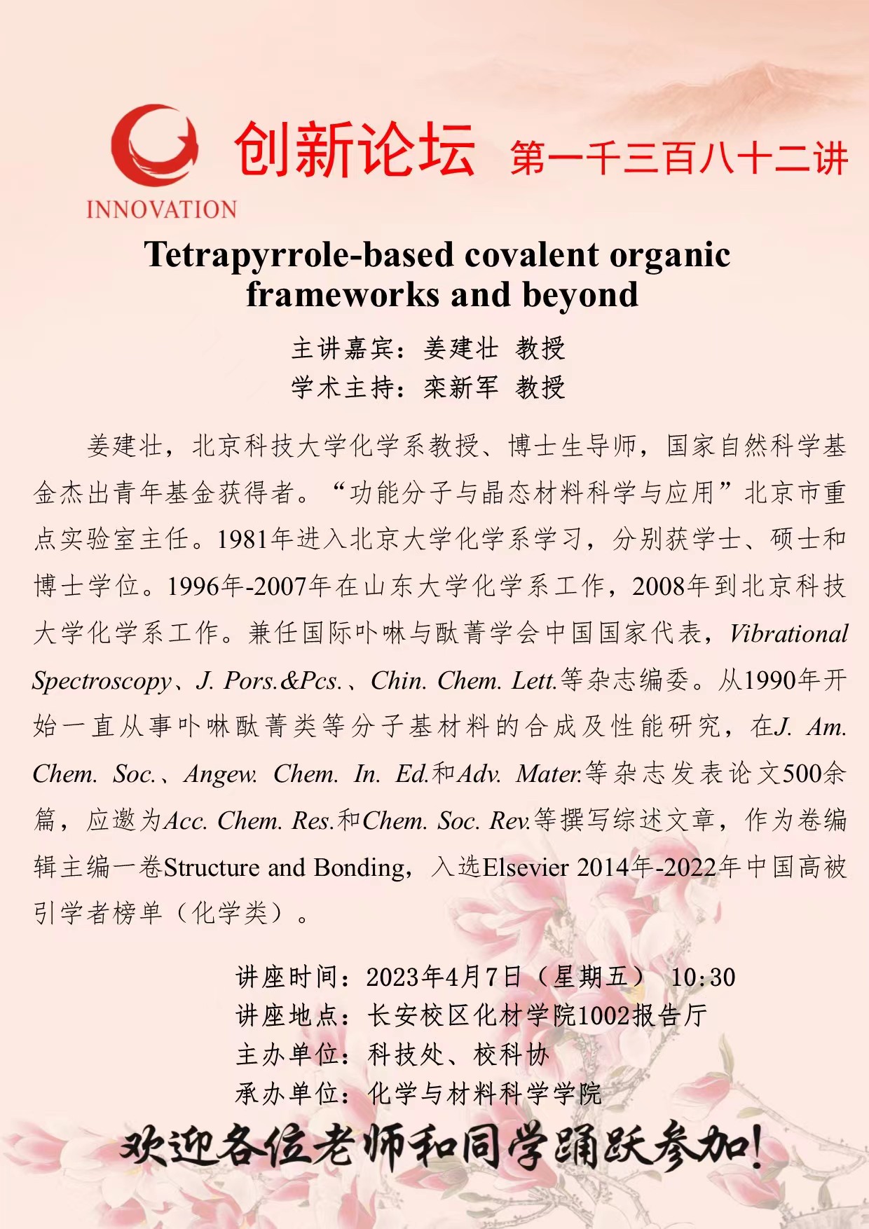 姜建壮 教 授 星空app官网创新论坛第一千三百八十二讲:Tetrapyrrole-based covalent organic frameworks and beyond 讲座时间 2023年4月7日(星期五) 10:30 讲座地点 长安校区化材学院1002报告厅 讲座人介绍 姜建壮 教 授 讲座内容