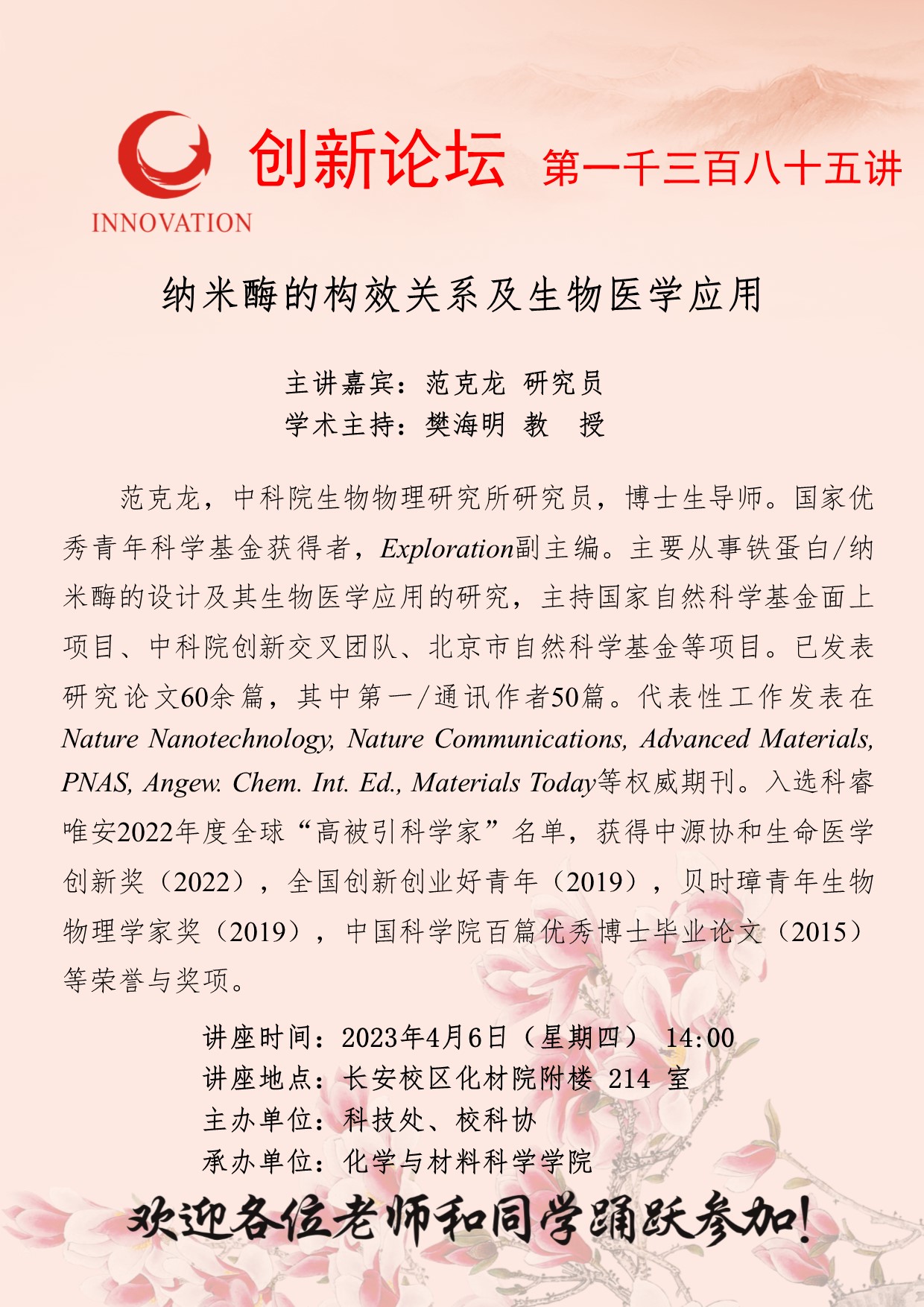 范克龙 研究员 星空app官网创新论坛第一千三百八十五讲:纳米酶的构效关系及生物医学应用 讲座时间 2023年4月6日(星期四) 14:00 讲座地点 长安校区化材院附楼 214 室 讲座人介绍 范克龙 研究员 讲座内容