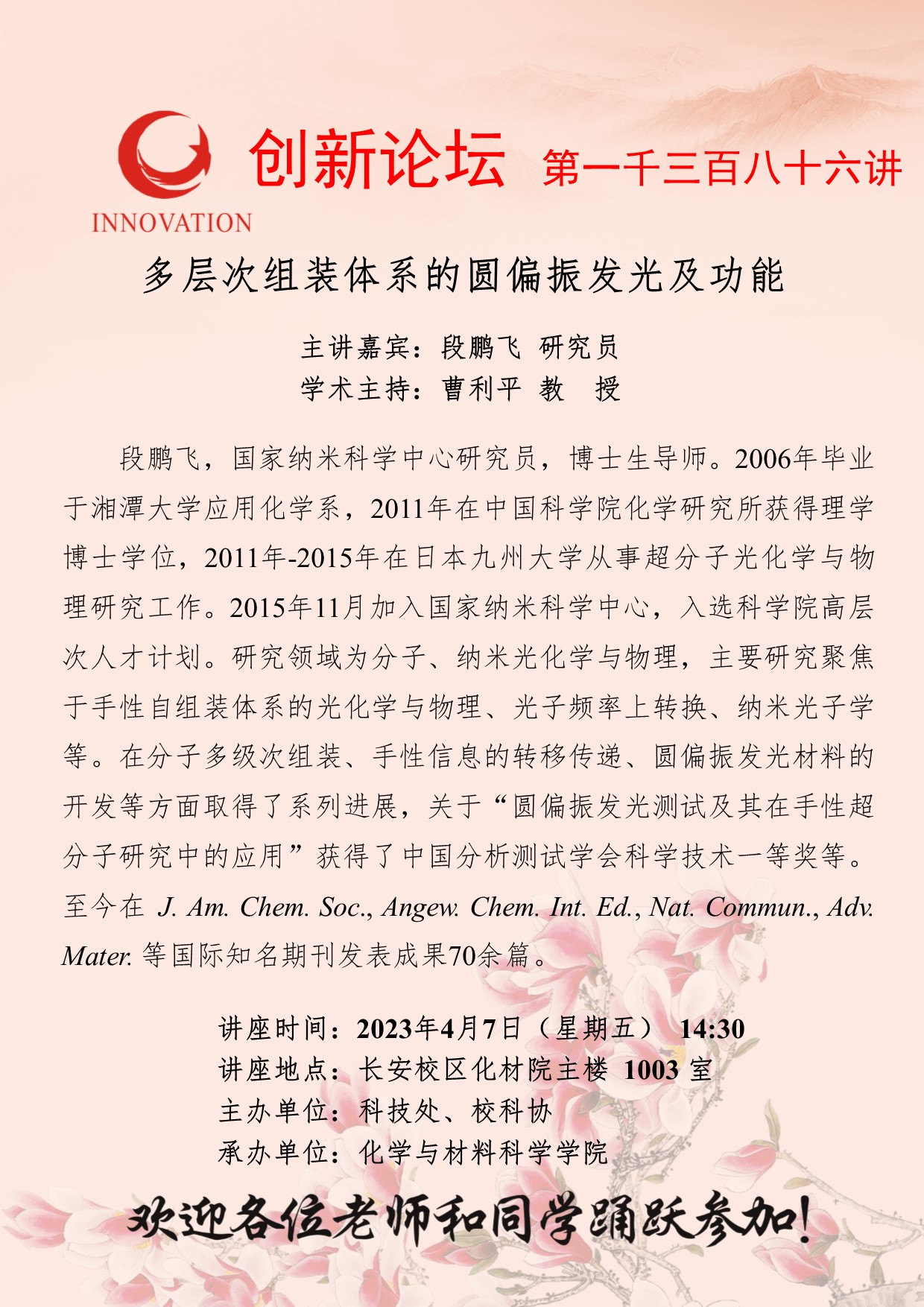 段鹏飞 研究员 星空app官网创新论坛第一千三百八十六讲:多层次组装体系的圆偏振发光及功能应用 讲座时间 2023年4月7日(星期五) 14:30 讲座地点 长安校区化材院主楼 1003 室 讲座人介绍 段鹏飞 研究员 讲座内容