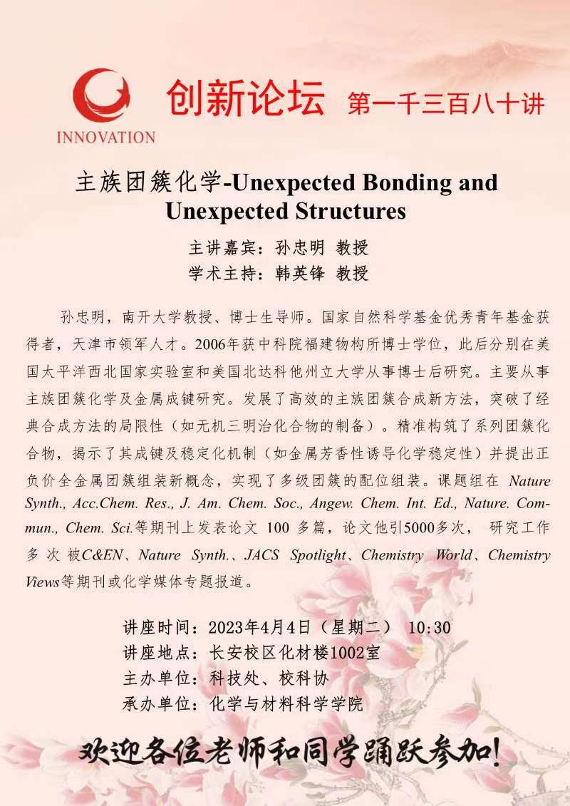 孙忠明 教授 星空app官网创新论坛第一千三百八十讲:主族团簇化学-Unexpected Bonding and Unexpected Structures 讲座时间 2023年4月4日(星期二) 10:30 讲座地点 长安校区化材楼1002室 讲座人介绍 孙忠明 教授 讲座内容