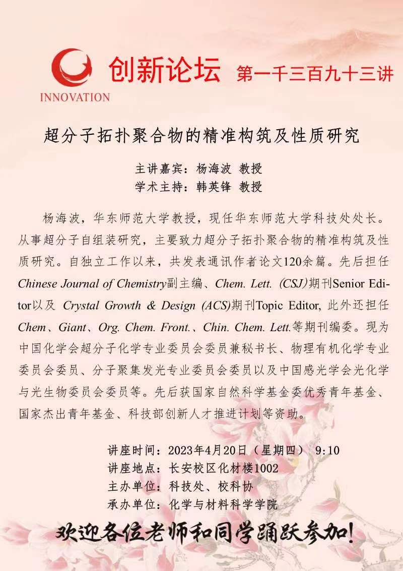 杨海波 教授 星空app官网创新论坛第一千三百九十三讲:超分子拓扑聚合物的精准构筑及性质研究 讲座时间 2023年4月20日(星期四) 9:10 讲座地点 长安校区化材楼1002 讲座人介绍 杨海波 教授 讲座内容