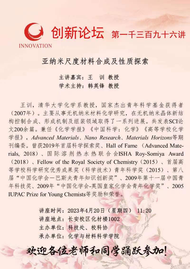 王 训 教授 星空app官网创新论坛第一千三百九十六讲:亚纳米尺度材料合成及性质探索 讲座时间 2023年4月20日(星期四) 11:20 讲座地点 长安校区化材楼1002 讲座人介绍 王 训 教授 讲座内容