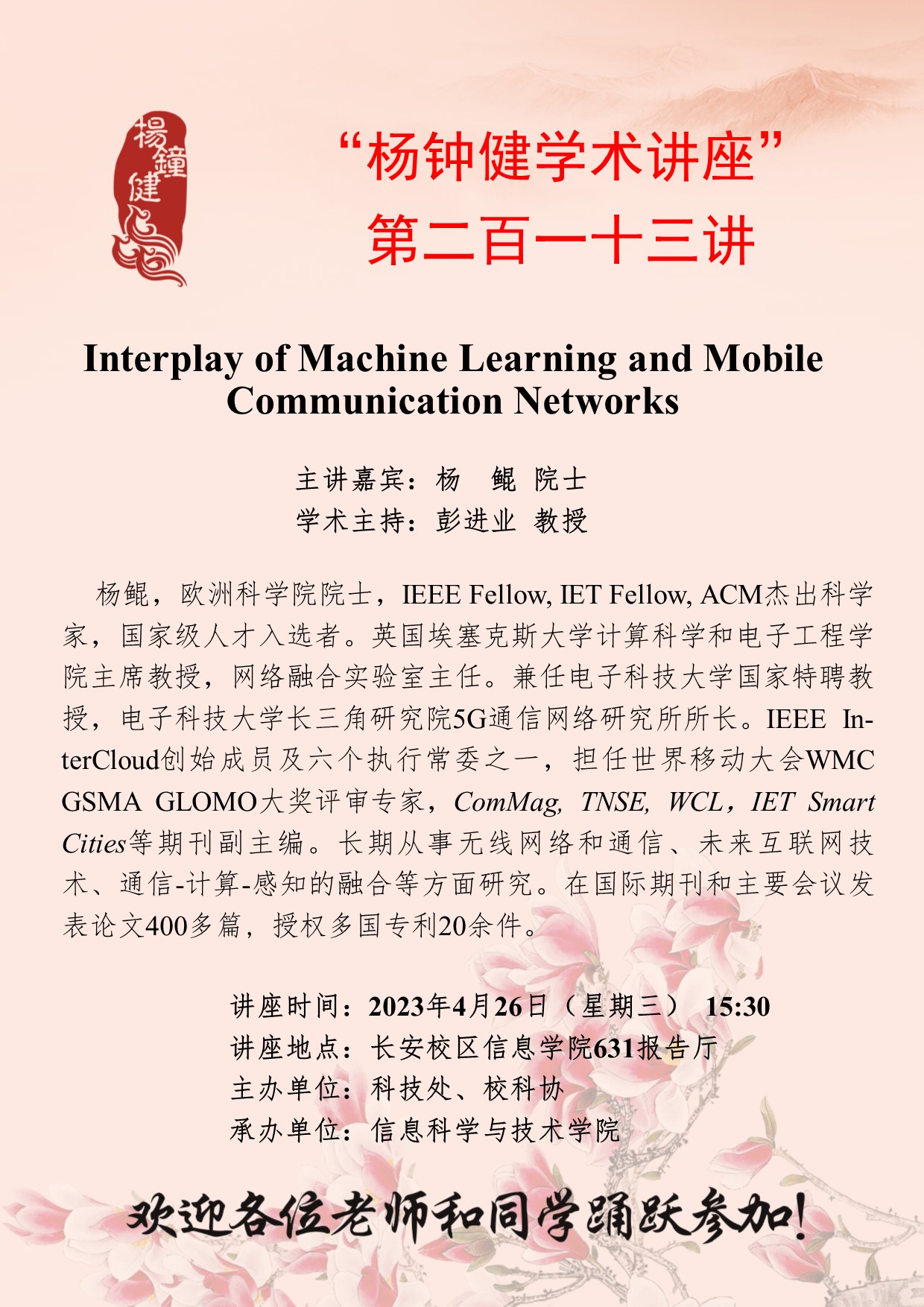 “杨钟健学术讲座”第二百一十三讲:Interplay of Machine Learning and Mobile Communication Networks