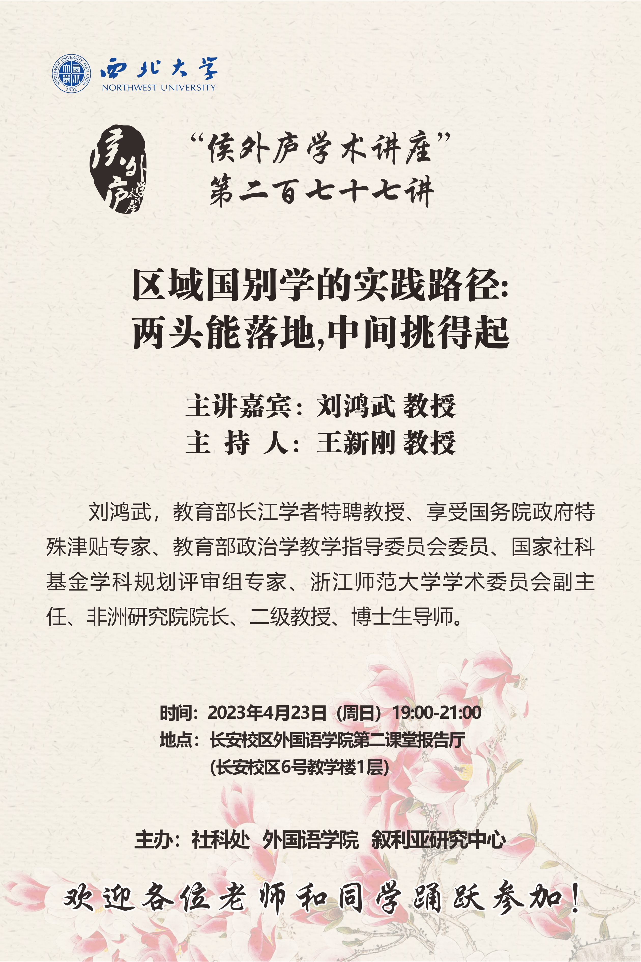 刘鸿武 教授 侯外庐学术讲座第二百七十七讲:区域国别学的实践路径:两头能落地,中间挑得起 讲座时间 2023年4月23日(周日)19:00 讲座地点 星空app官网外国语学院第二课堂报告厅 讲座人介绍 刘鸿武 教授 讲座内容