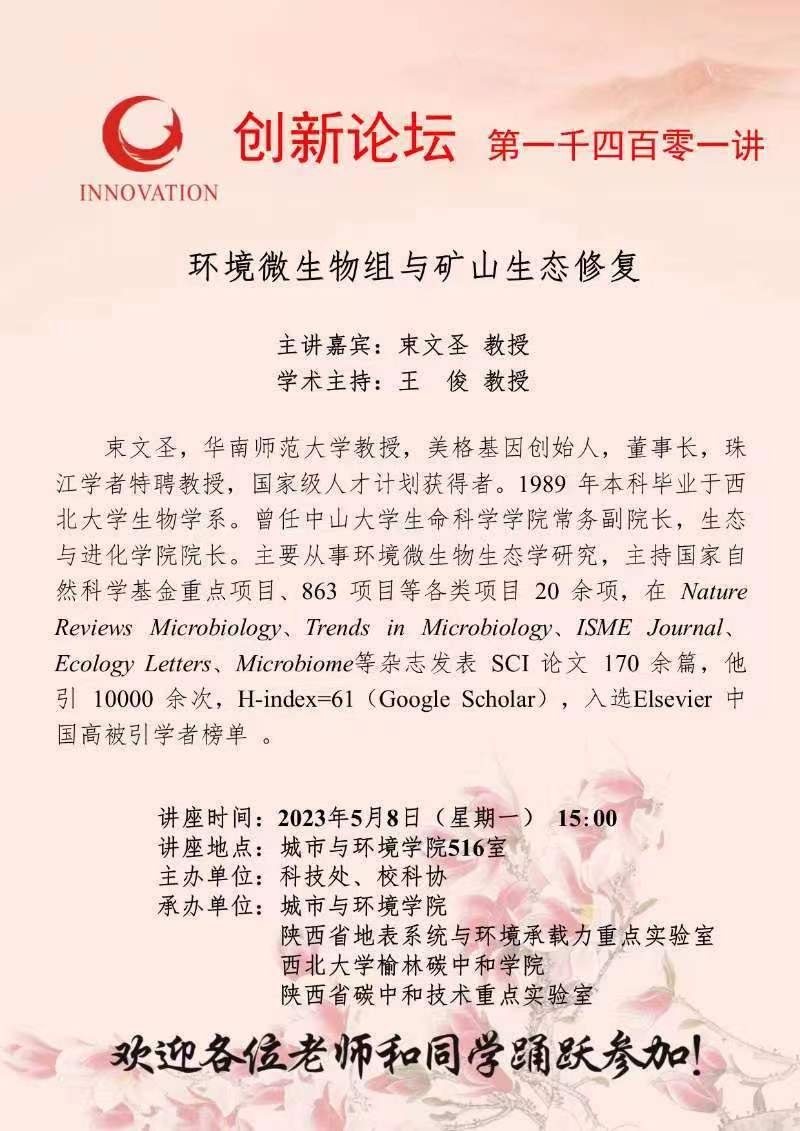 束文圣 教授 星空app官网创新论坛第一千四百零一讲:环境微生物组与矿山生态修复 讲座时间 2023年5月8日(星期一) 15:00 讲座地点 城市与环境学院516室 讲座人介绍 束文圣 教授 讲座内容