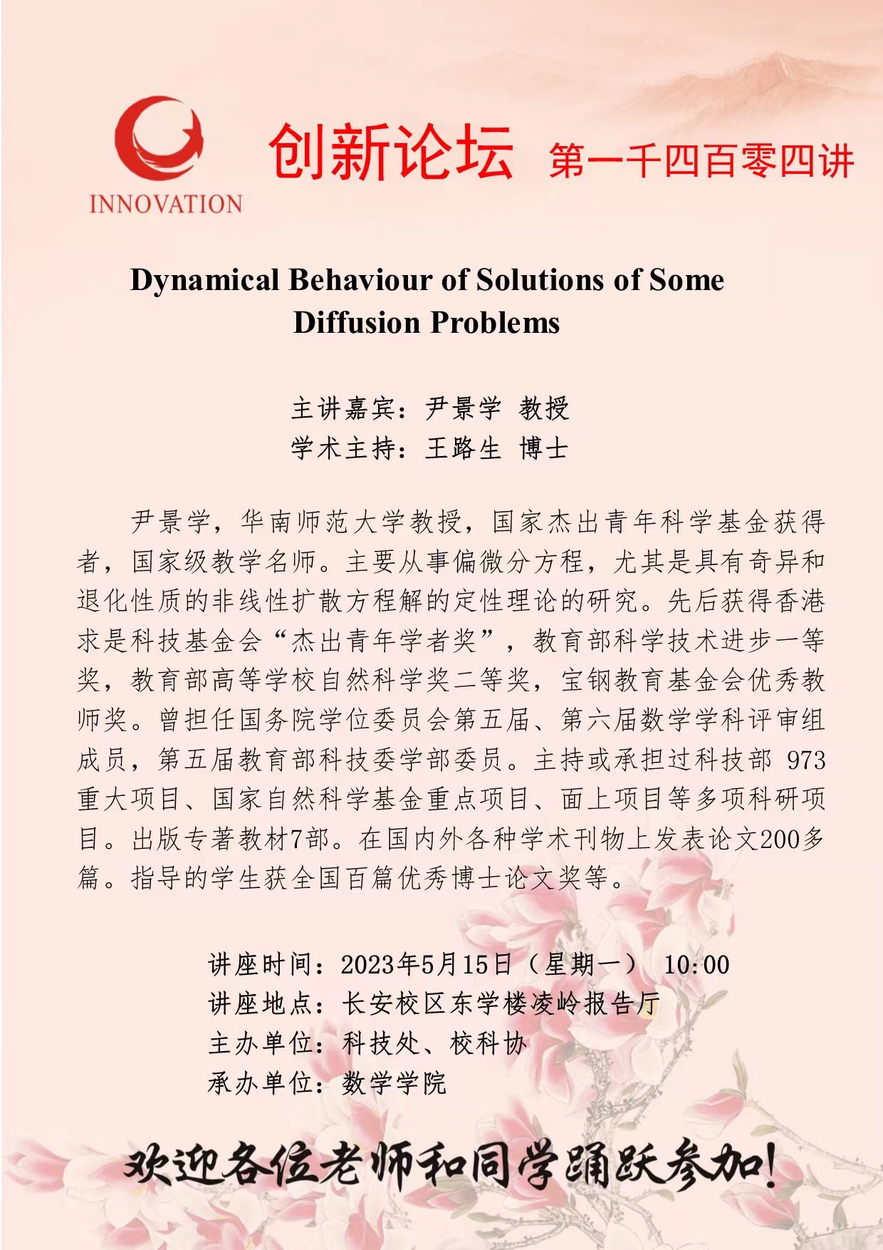 尹景学 教授 星空app官网创新论坛第一千四百零四讲:Dynamical Behaviour of Solutions of Some Diffusion Problems 讲座时间 2023年5月15日(星期一) 10:00 讲座地点 长安校区东学楼凌岭报告厅 讲座人介绍 尹景学 教授 讲座内容