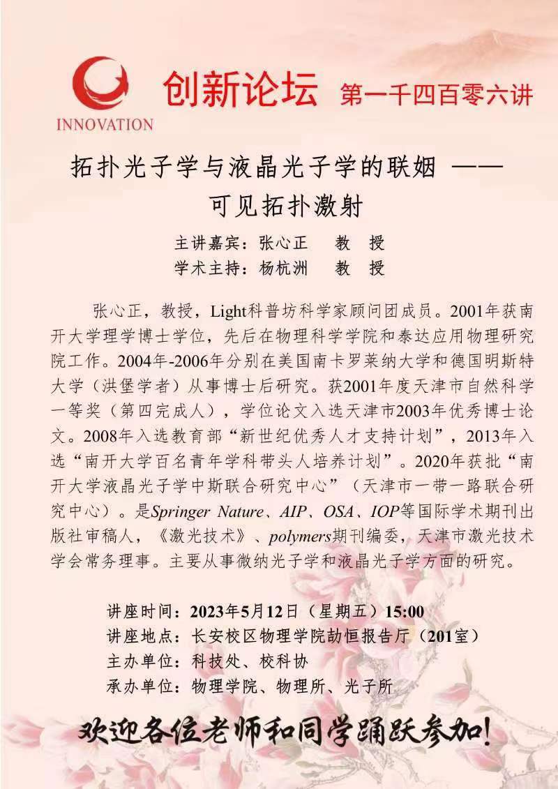 张心正 教 授 星空app官网创新论坛第一千四百零六讲:拓扑光子学与液晶光子学的联姻 — 可见拓扑激射 讲座时间 2023年5月12日(星期五)15:00 讲座地点 长安校区物理学院劼恒报告厅(201室) 讲座人介绍 张心正 教 授 讲座内容