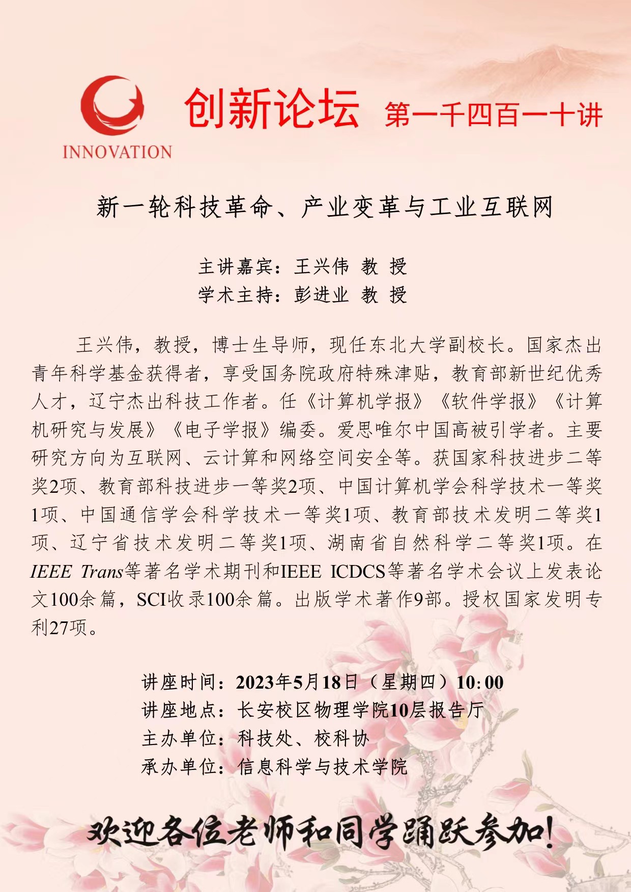 王兴伟 教 授 星空app官网创新论坛第一千四百零一十讲:新一轮科技革命、产业变革与工业互联网 讲座时间 2023年5月18日(星期四)10:00 讲座地点 长安校区物理学院10层报告厅 讲座人介绍 王兴伟 教 授 讲座内容