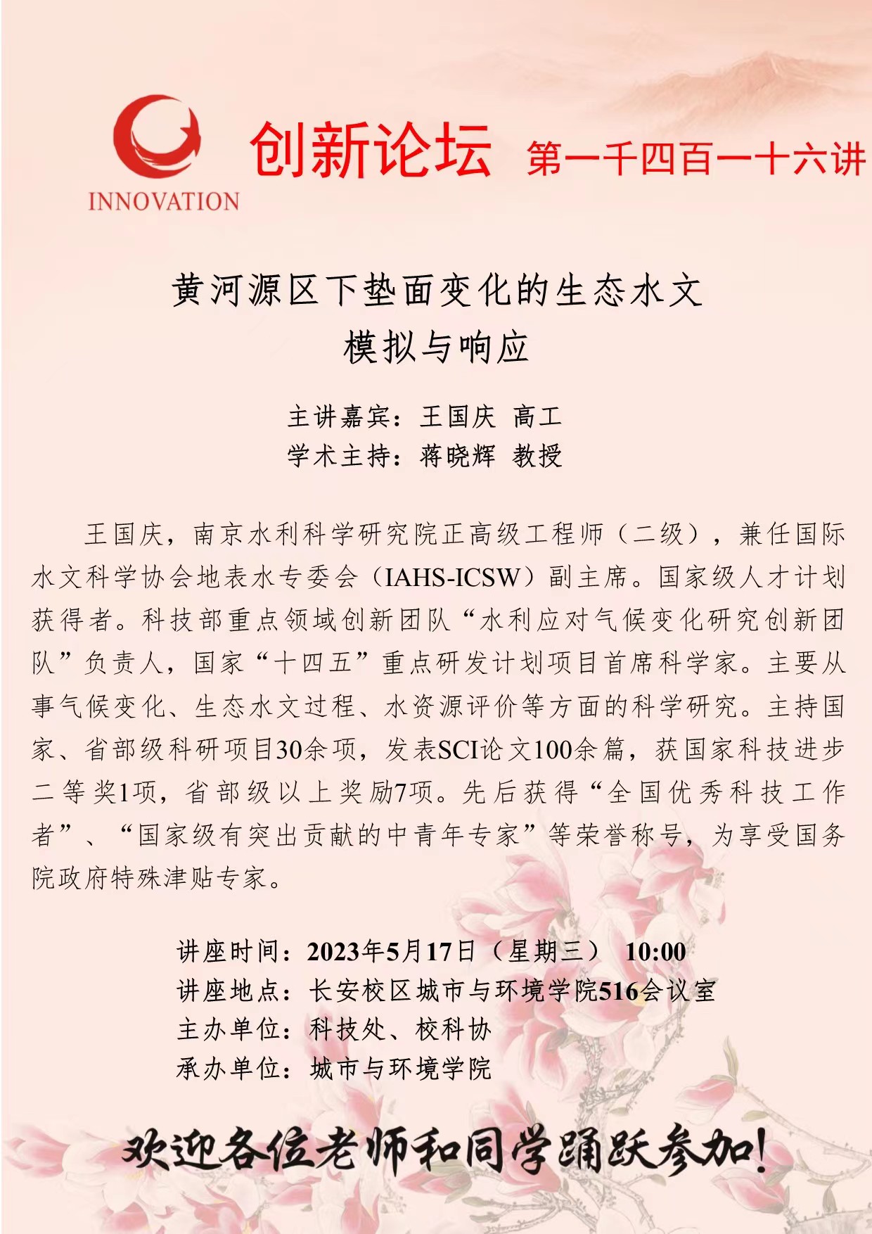 王国庆 高工 星空app官网创新论坛第一千四百一十六讲:黄河源区下垫面变化的生态水文模拟与响应 讲座时间 2023年5月17日(星期三) 10:00 讲座地点 长安校区城市与环境学院516会议室 讲座人介绍 王国庆 高工 讲座内容