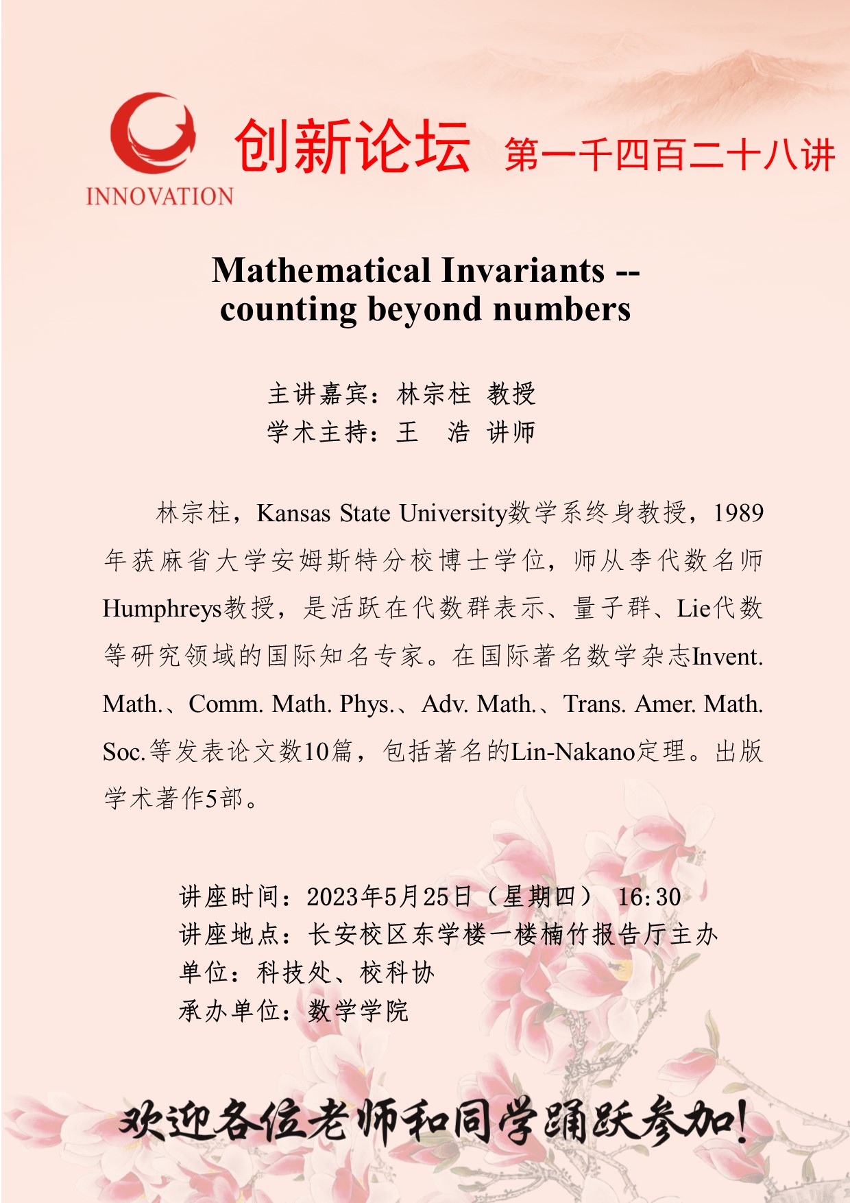 林宗柱 教授 星空app官网创新论坛第一千四百二十八讲:Mathematical Invariants --counting beyond numbers 讲座时间 2023年5月25日(星期四)16:30 讲座地点 长安校区东学楼一楼楠竹报告厅 讲座人介绍 林宗柱 教授 讲座内容