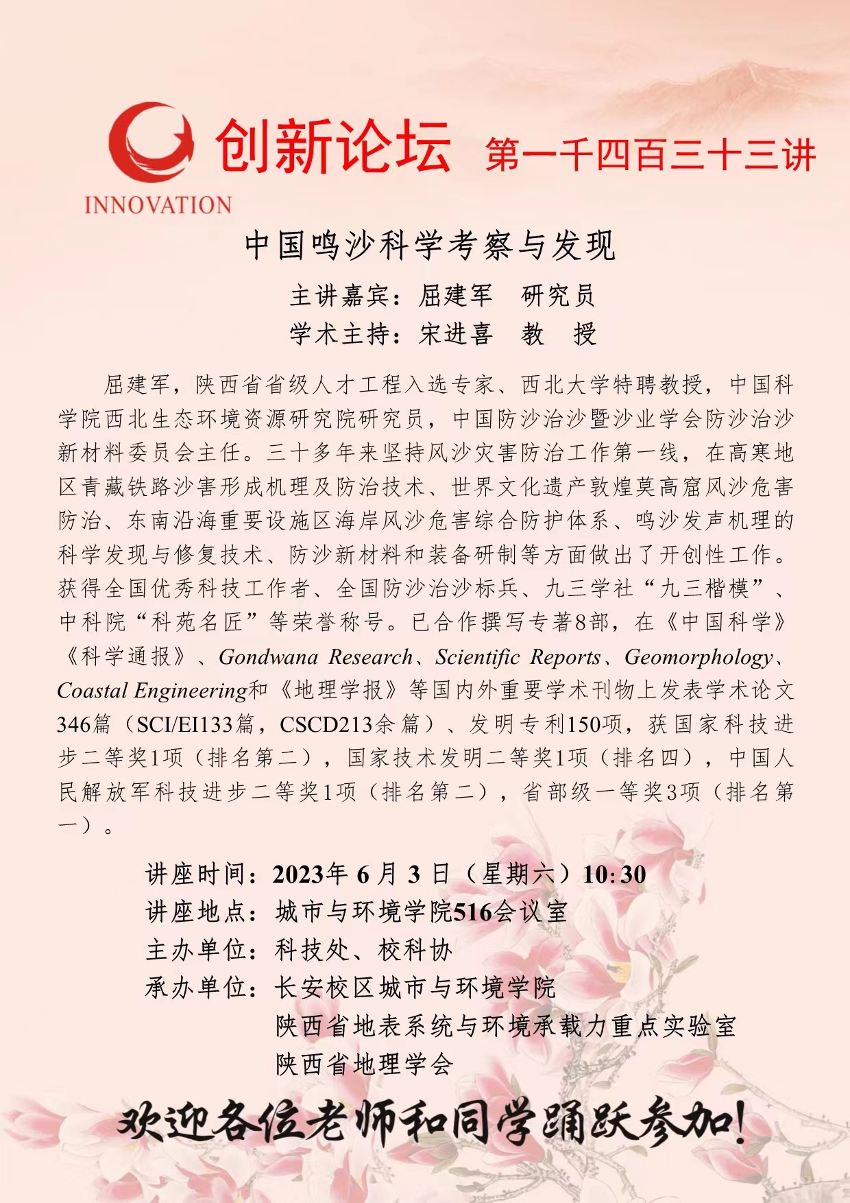 屈建军 研究员 星空app官网创新论坛第一千四百三十三讲:中国鸣沙科学考察与发现 讲座时间 2023年6月3日(星期六)10:30 讲座地点 城市与环境学院516会议室 讲座人介绍 屈建军 研究员 讲座内容