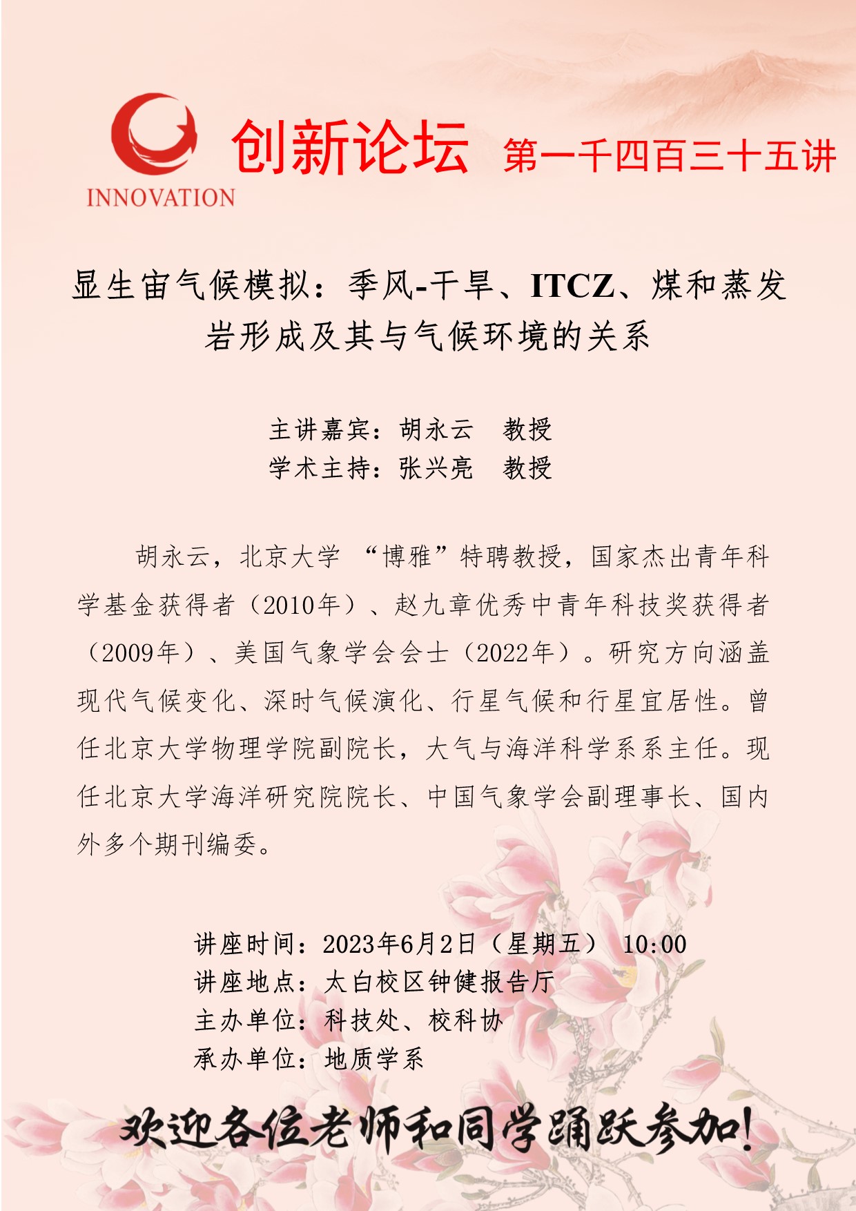 胡永云 教授 星空app官网创新论坛第一千四百三十五讲:显生宙气候模拟:季风-干旱、ITCZ、煤和蒸发岩形成及其与气候环境的关系 讲座时间 2023年6月2日(星期五) 10:00 讲座地点 太白校区钟健报告厅 讲座人介绍 胡永云 教授 讲座内容