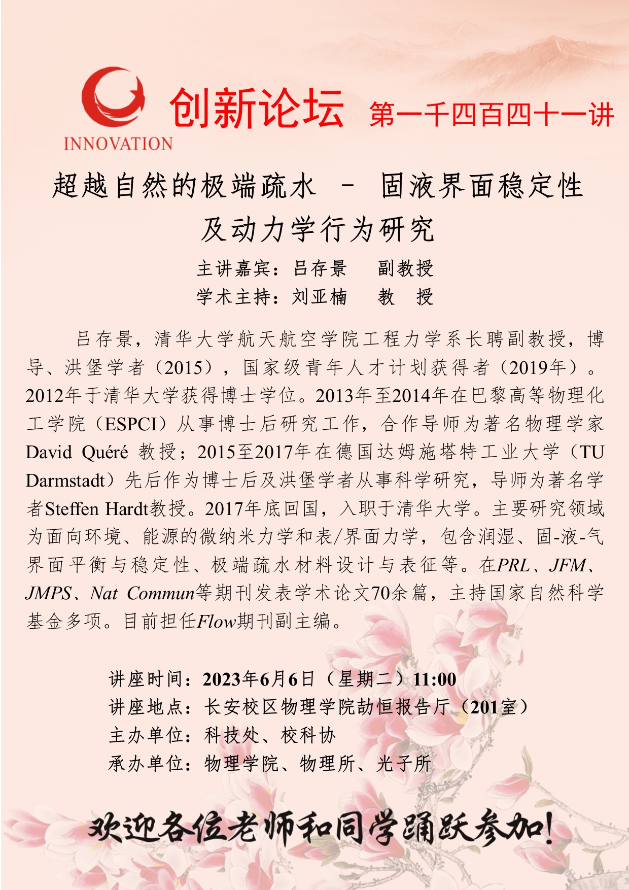 吕存景 副教授 星空app官网创新论坛第一千四百四十一讲:超越自然的极端疏水 – 固液界面稳定性及动力学行为研究 讲座时间 2023年6月6日(星期二)11:00 讲座地点 长安校区物理学院劼恒报告厅(201室) 讲座人介绍 吕存景 副教授 讲座内容
