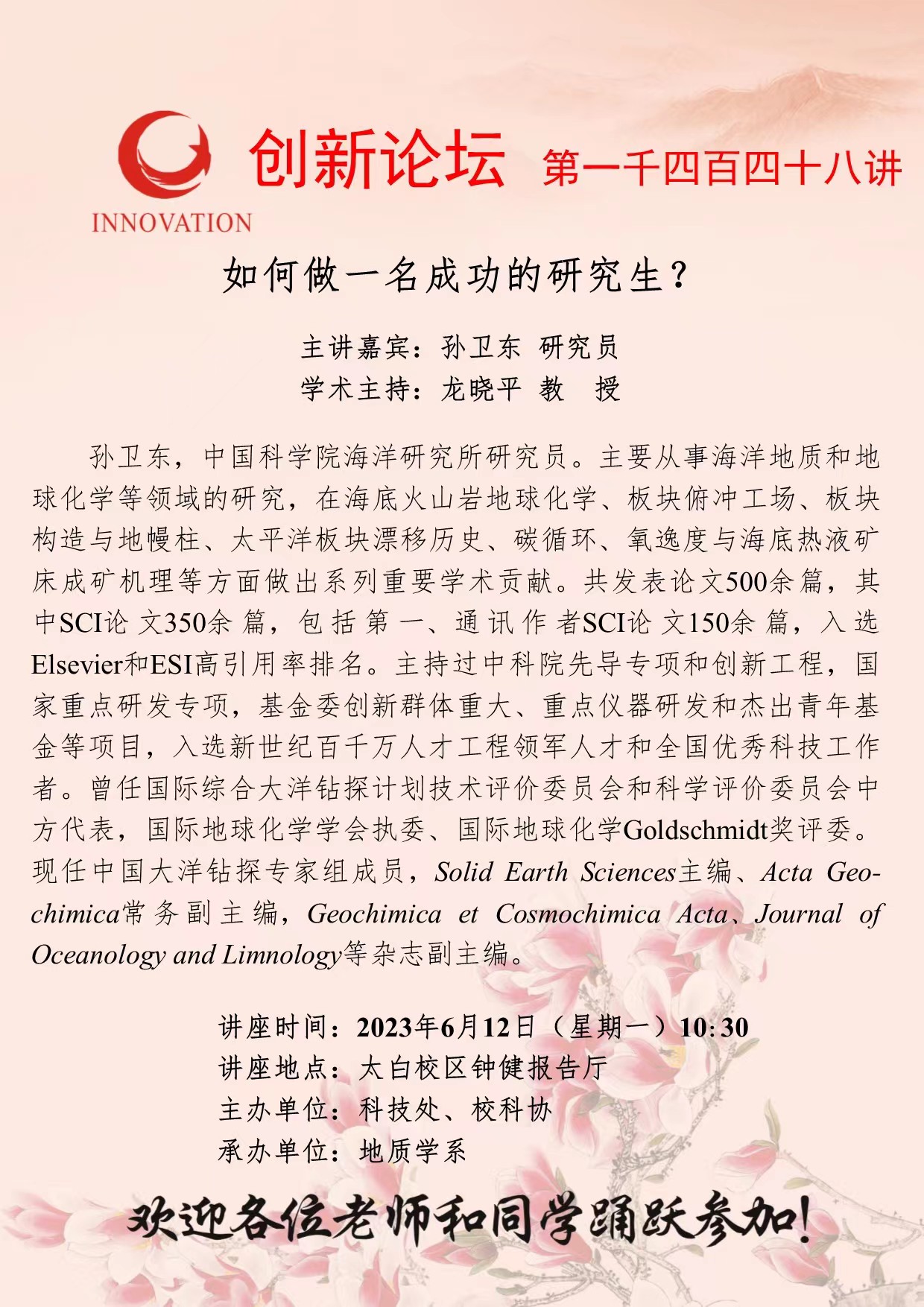 孙卫东 教 授 星空app官网创新论坛第一千四百四十八讲:如何做一名成功的研究生? 讲座时间 2023年6月12日(星期一)10:30 讲座地点 太白校区钟健报告厅 讲座人介绍 孙卫东 教 授 讲座内容