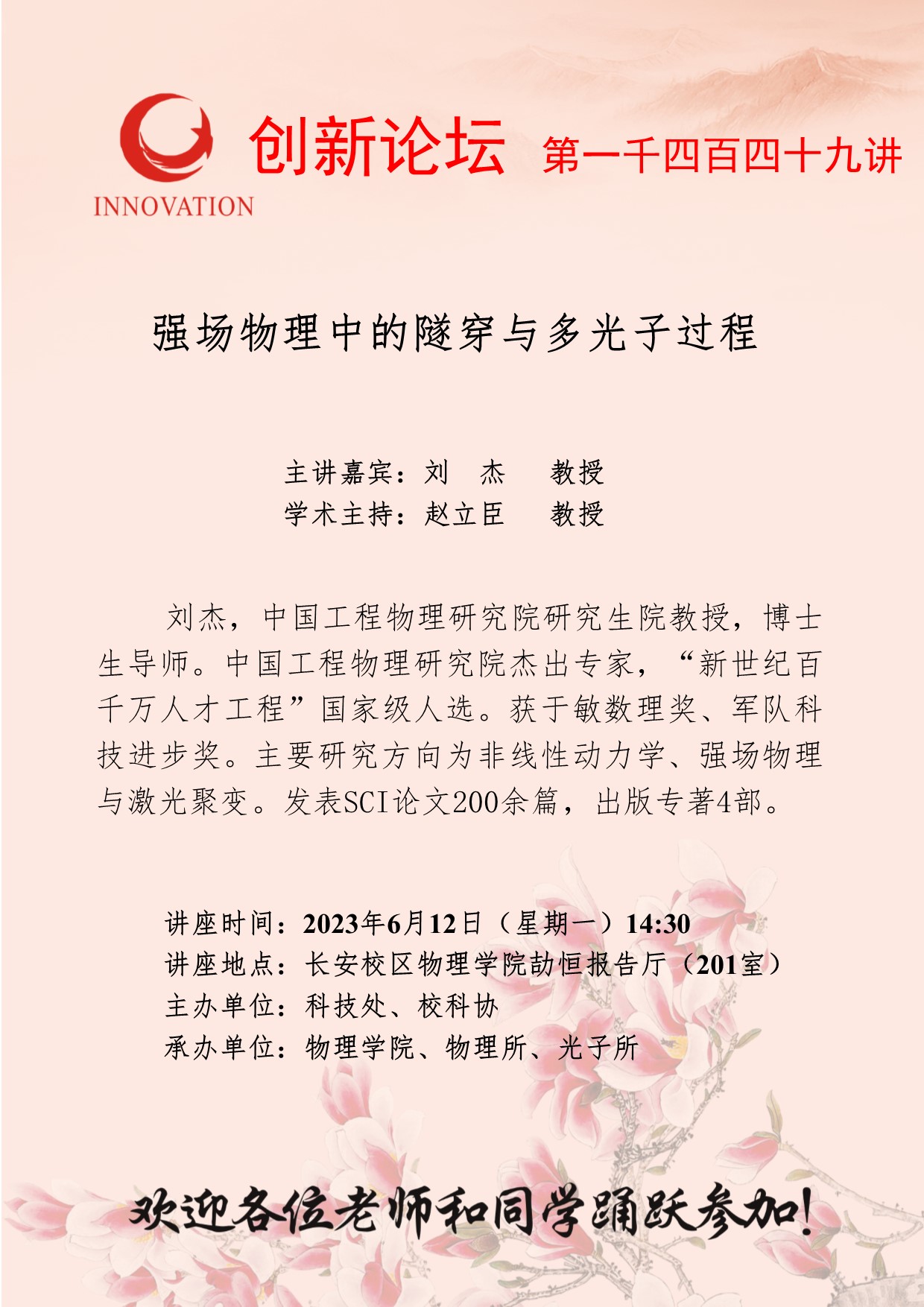 刘 杰 教授 星空app官网创新论坛第一千四百四十九讲:强场物理中的隧穿与多光子过程 讲座时间 2023年6月12日(星期一)14:30 讲座地点 长安校区物理学院劼恒报告厅(201室) 讲座人介绍 刘 杰 教授 讲座内容
