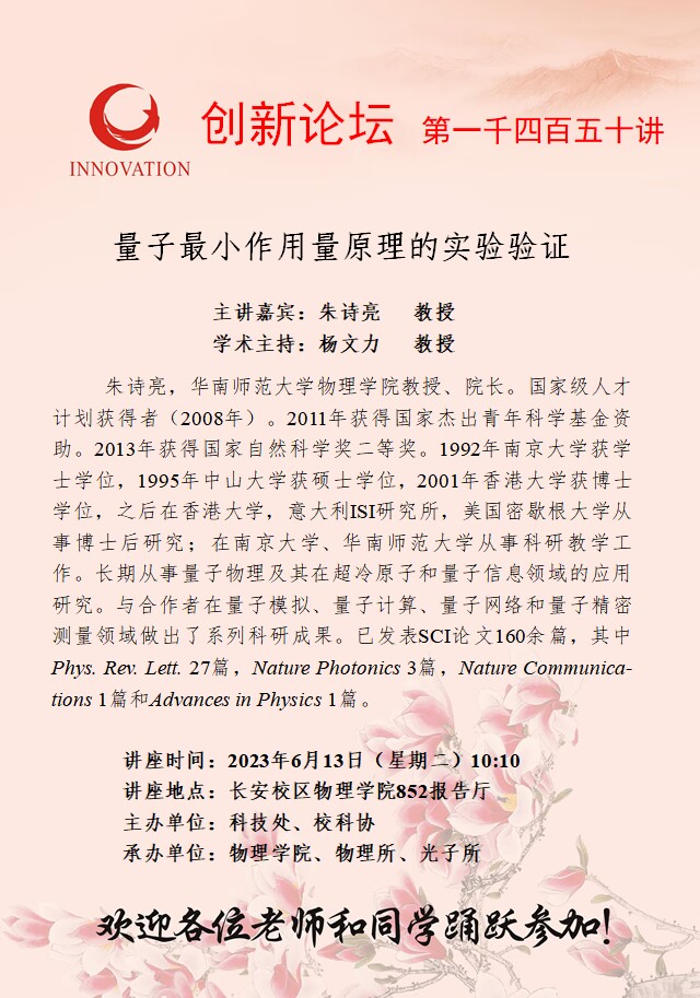 朱诗亮 教授 星空app官网创新论坛第一千四百五十讲:量子最小作用量原理的实验验证 讲座时间 2023年6月13日(星期二)10:10 讲座地点 长安校区物理学院852报告厅 讲座人介绍 朱诗亮 教授 讲座内容