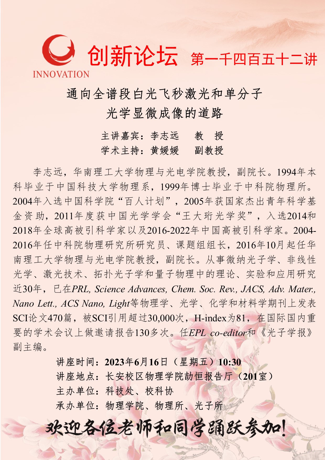 李志远 教授 星空app官网创新论坛第一千四百五十二讲:通向全谱段白光飞秒激光和单分子光学显微成像的道路 讲座时间 2023年6月16日(星期五)10:30 讲座地点 长安校区物理学院劼恒报告厅(201室) 讲座人介绍 李志远 教授 讲座内容