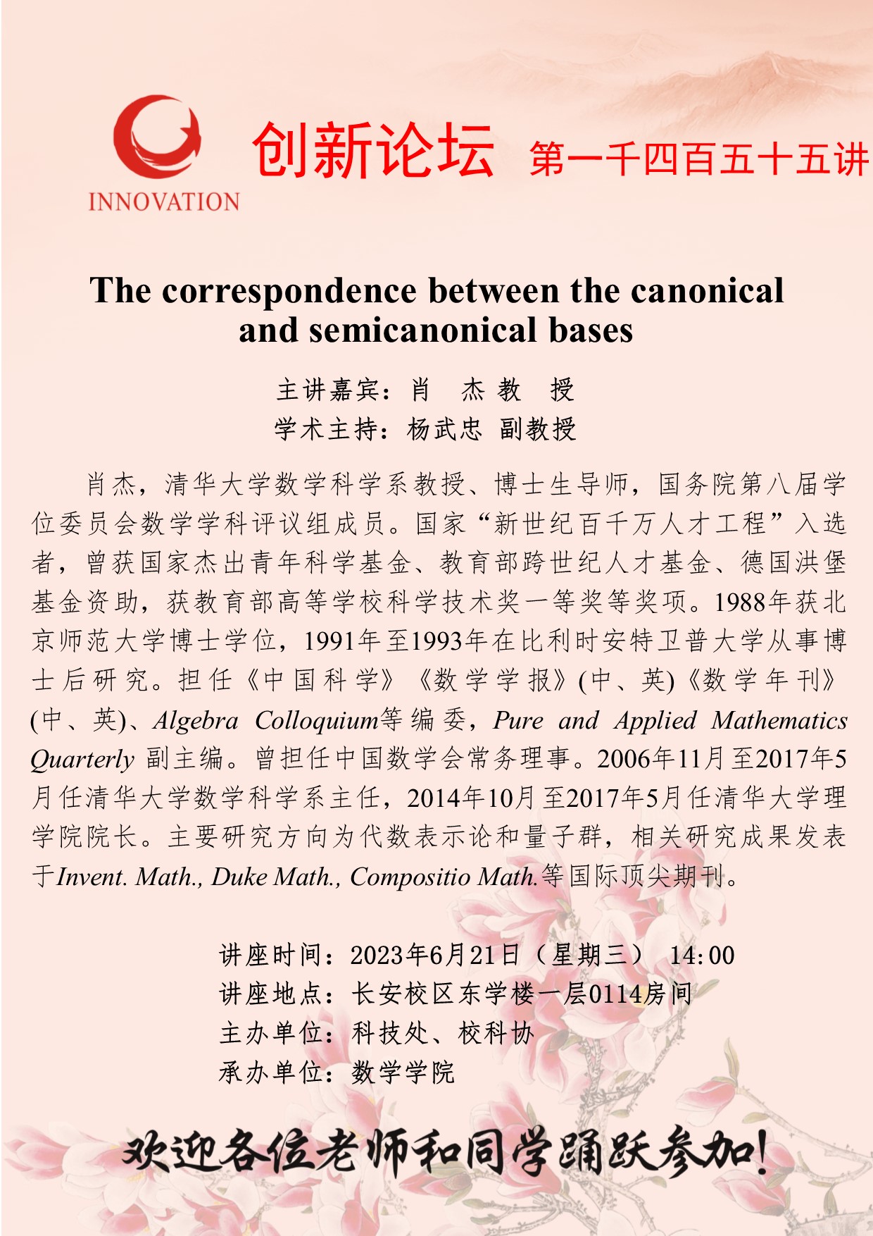 肖杰 教授 星空app官网创新论坛第一千四百五十五讲:The correspondence between the canonical and semicanonical bases 讲座时间 2023年6月21日(星期三) 14:00 讲座地点 长安校区东学楼一层0114房间 讲座人介绍 肖杰 教授 讲座内容