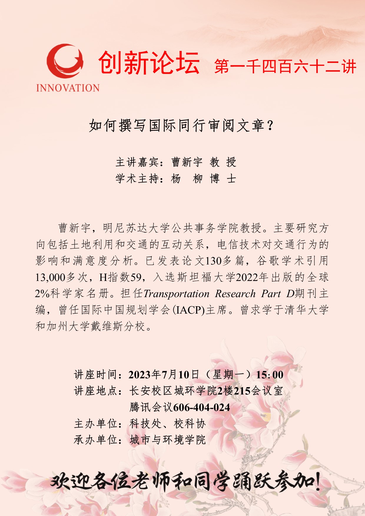 曹新宇 教授 星空app官网创新论坛第一千四百六十二讲:如何撰写国际同行审阅文章? 讲座时间 2023年7月10日(星期一)15:00 讲座地点 长安校区城环学院2楼215会议室 讲座人介绍 曹新宇 教授 讲座内容