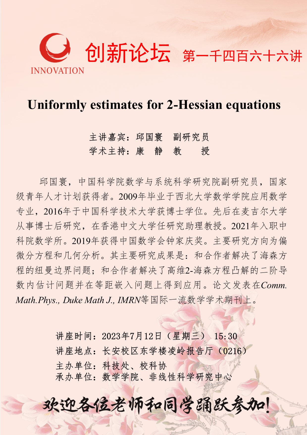 邱国寰 副研究员 星空app官网创新论坛第一千四百六十六讲:Uniformly estimates for 2-Hessian equations 讲座时间 2023年7月12日(星期三) 15:30 讲座地点 长安校区东学楼凌岭报告厅(0216) 讲座人介绍 邱国寰 副研究员 讲座内容
