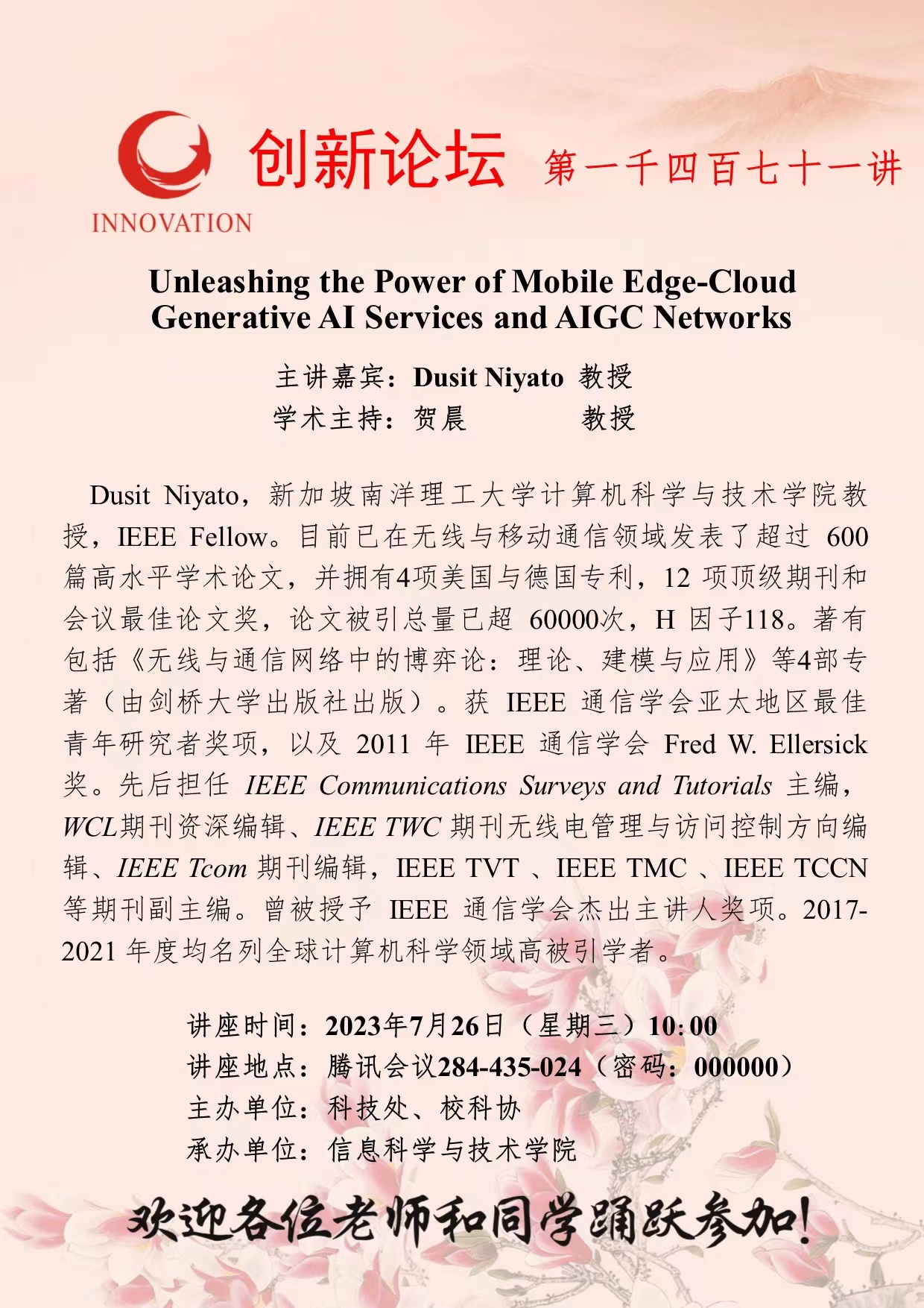 Dusit Niyato 教授 星空app官网创新论坛第一千四百七十一讲:Unleashing the Power of Mobile Edge-Cloud Generative AI Services and AIGC Networks 讲座时间 2023年7月26日(星期三)10:00 讲座地点 腾讯会议284-435-024(密码:000000) 讲座人介绍 Dusit Niyato 教授 讲座内容
