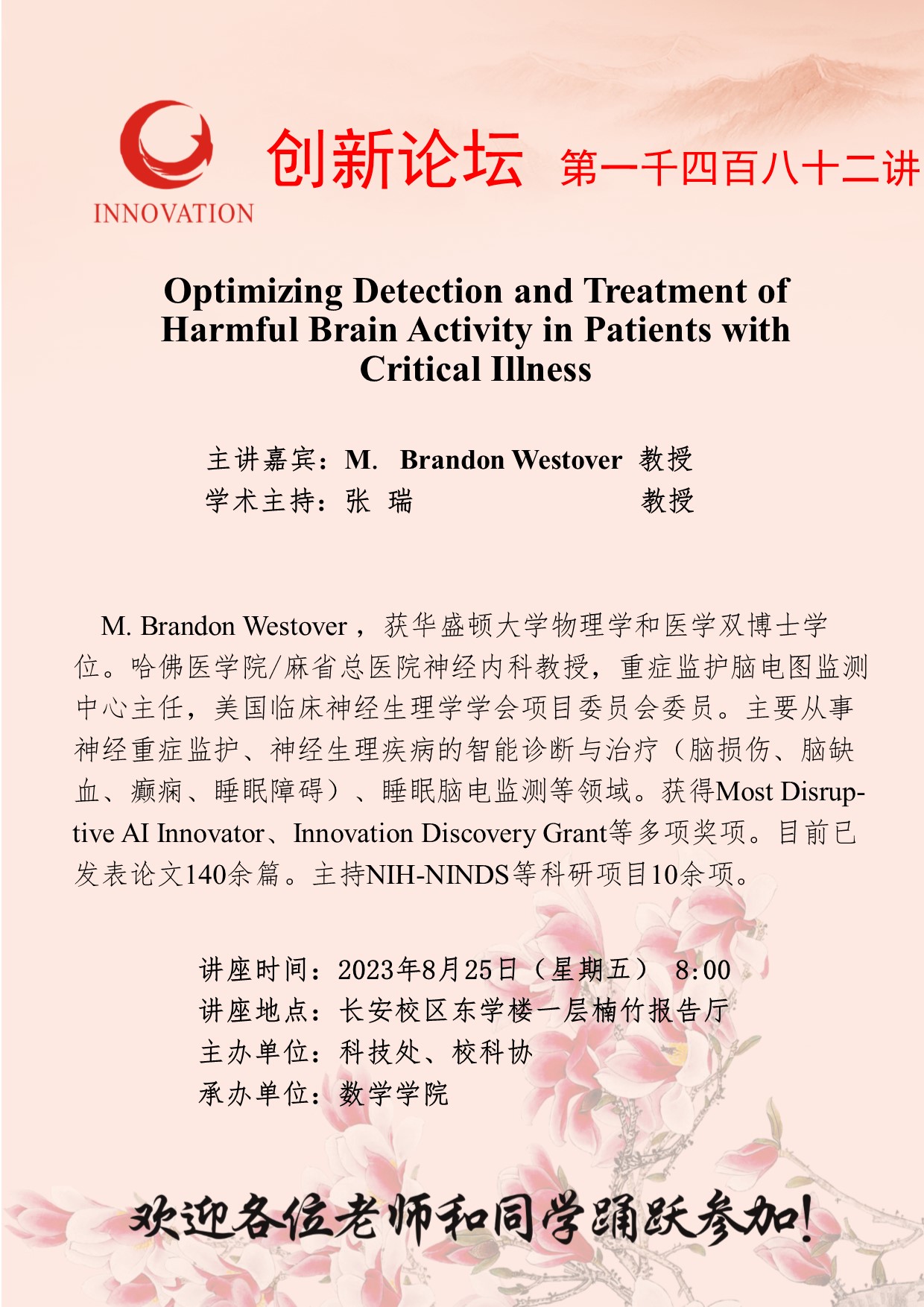 M. Brandon Westover 教授 星空app官网创新论坛第一千四百八十二讲:Optimizing Detection and Treatment of Harmful Brain Activity in Patients with Critical Illness 讲座时间 2023年8月25日(星期五) 8:00 讲座地点 长安校区东学楼一层楠竹报告厅 讲座人介绍 M. Brandon Westover 教授 讲座内容