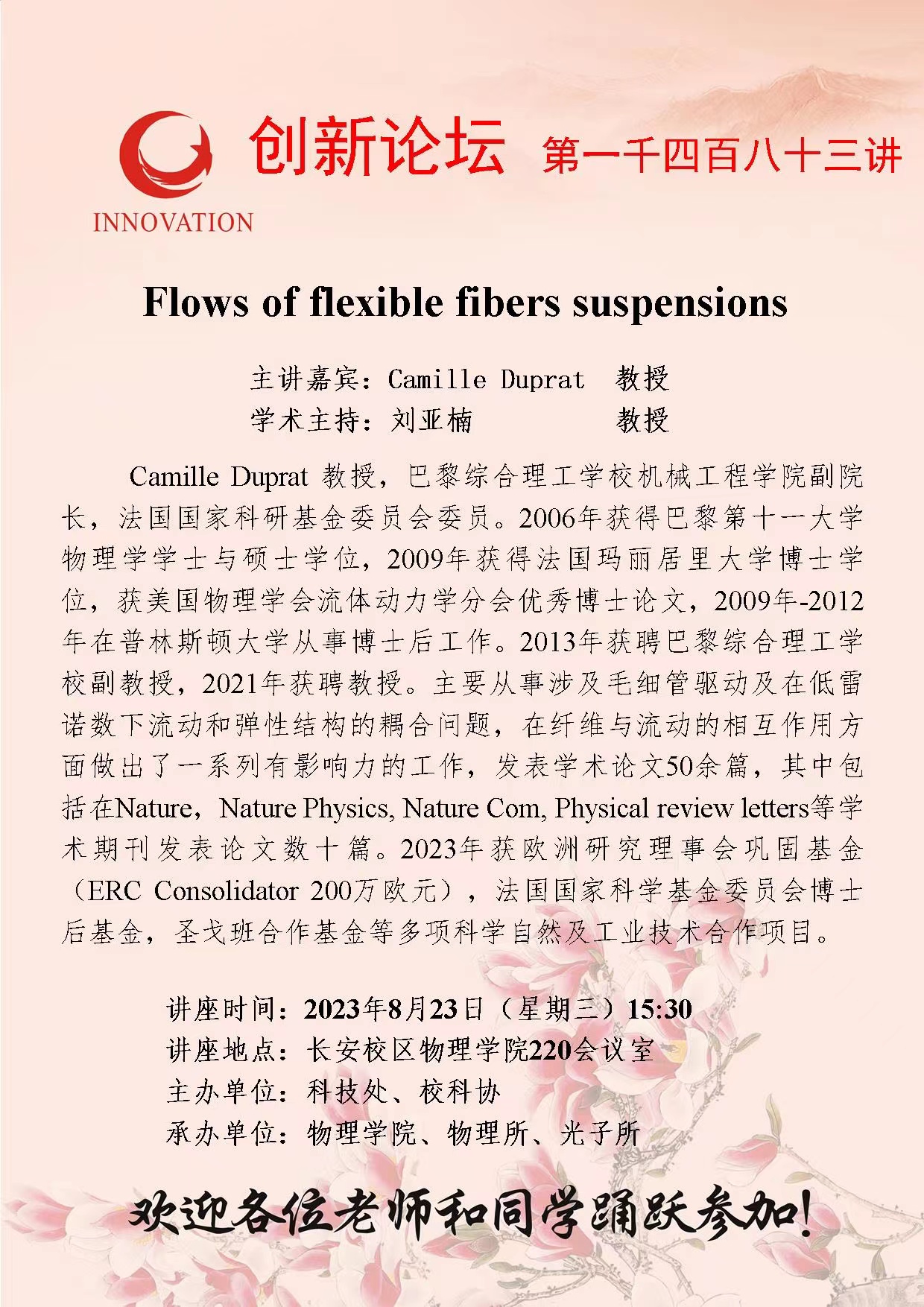 Camille Duprat 教授 星空app官网创新论坛第一千四百八十三讲:Flows of flexible fibers suspensions 讲座时间 2023年8月23日(星期三) 15:30 讲座地点 长安校区物理学院220会议室 讲座人介绍 Camille Duprat 教授 讲座内容