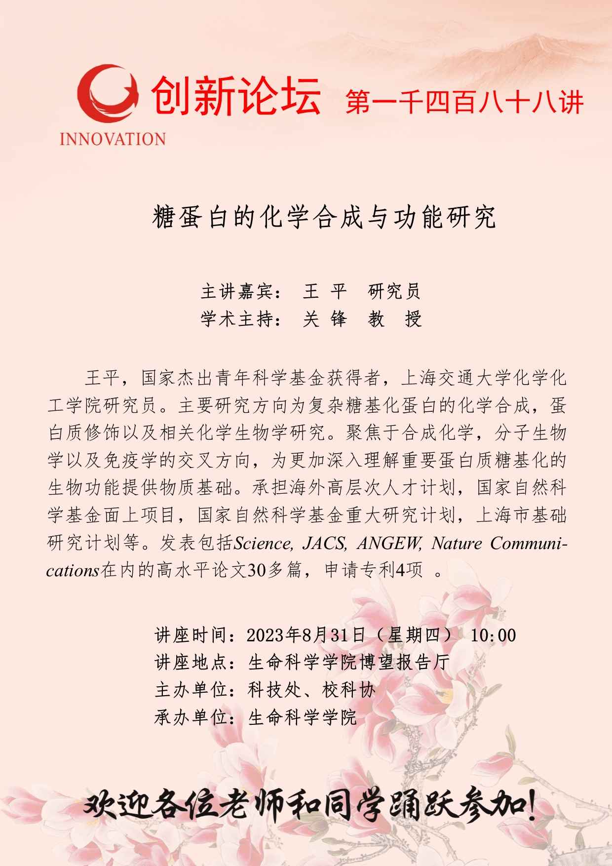 王平 研究员 星空app官网创新论坛第一千四百八十八讲:糖蛋白的化学合成与功能研究 讲座时间 2023年8月31日(星期四) 10:00 讲座地点 生命科学学院博望报告厅 讲座人介绍 王平 研究员 讲座内容