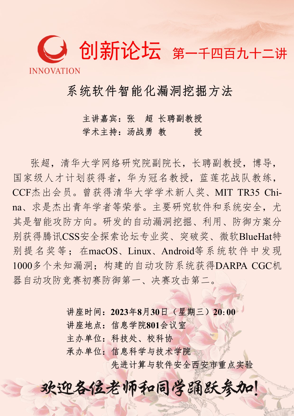 张超 长聘副教授 星空app官网创新论坛第一千四百九十二讲:系统软件智能化漏洞挖掘方法 讲座时间 2023年8月30日(星期三)20:00 讲座地点 信息学院801会议室 讲座人介绍 张超 长聘副教授 讲座内容