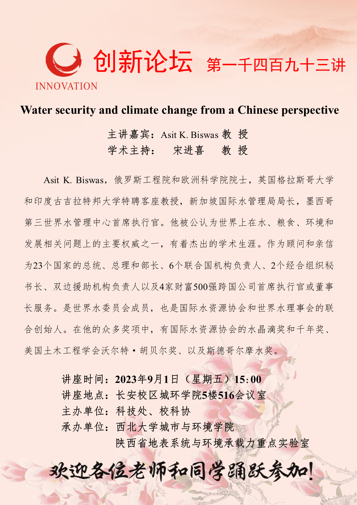 Asit K. Biswas 教授 星空app官网创新论坛第一千四百九十三讲:Water security and climate change from a Chinese perspective 讲座时间 2023年9月1日(星期五)15:00 讲座地点 长安校区城环学院5楼516会议室 讲座人介绍 Asit K. Biswas 教授 讲座内容