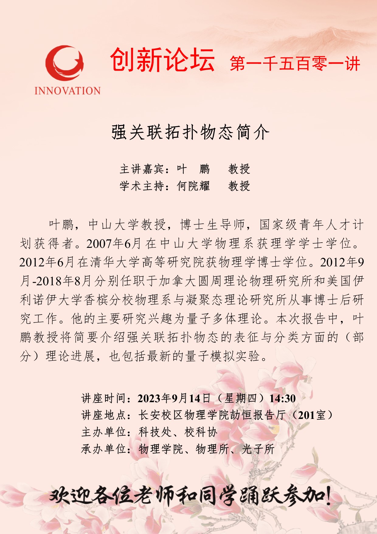 叶鹏 教授 星空app官网创新论坛第一千五百零一讲:强关联拓扑物态简介 讲座时间 2023年9月14日(星期四)14:30 讲座地点 长安校区物理学院劼恒报告厅(201室) 讲座人介绍 叶鹏 教授 讲座内容