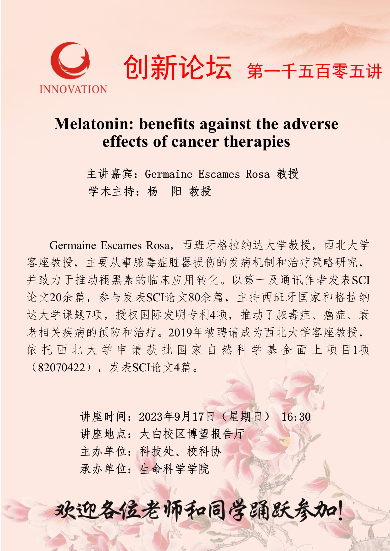 Germaine Escames Rosa 教授 星空app官网创新论坛第一千五百零五讲:Melatonin: benefits against the adverse effects of cancer therapies 讲座时间 2023年9月17日(星期日) 16:30 讲座地点 太白校区博望报告厅 讲座人介绍 Germaine Escames Rosa 教授 讲座内容