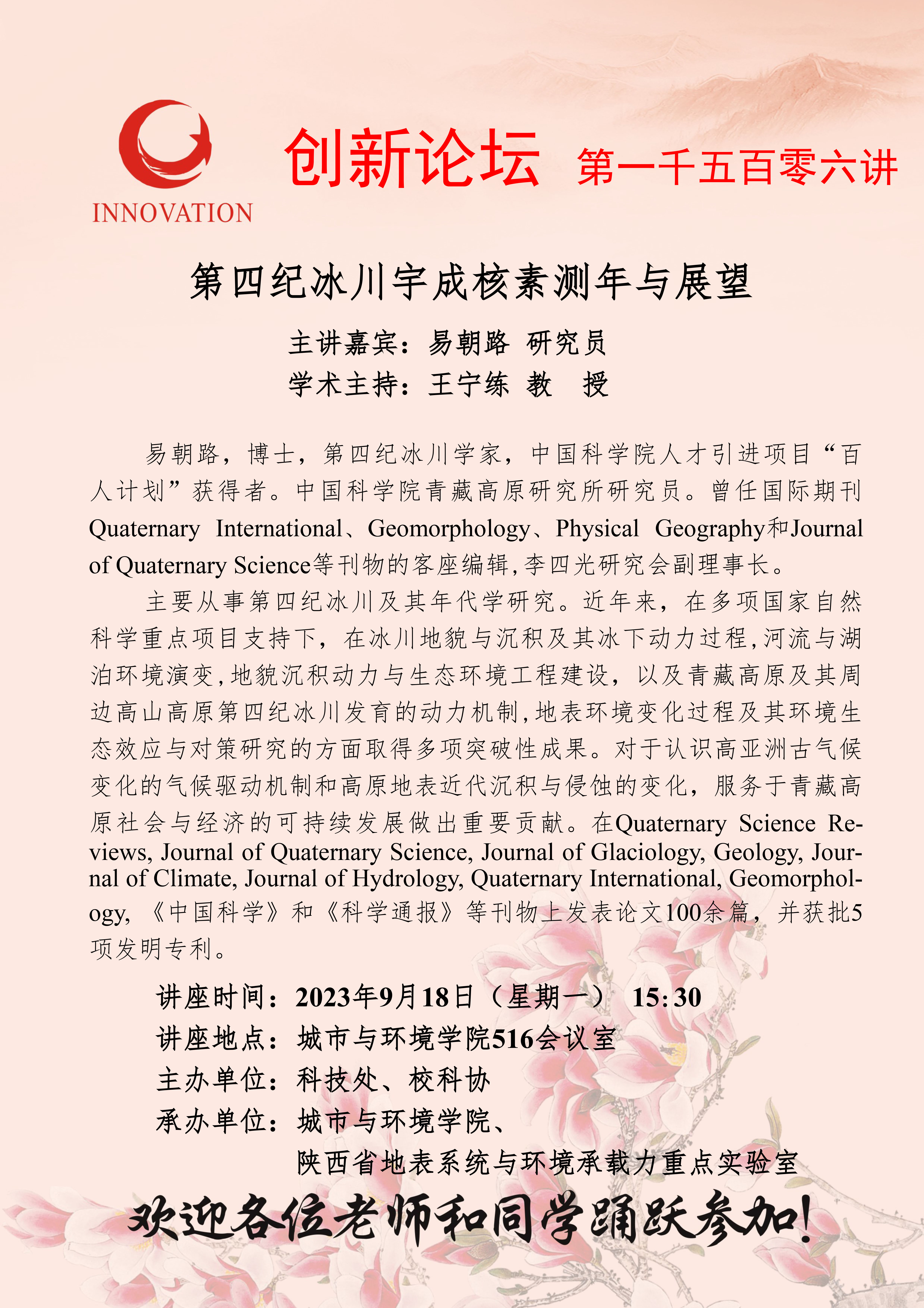 易朝路 研究员 星空app官网创新论坛第一千五百零六讲:第四纪冰川宇成核素测年与展望 讲座时间 2023年9月18日(星期一)15:30 讲座地点 城市与环境学院516会议室 讲座人介绍 易朝路 研究员 讲座内容