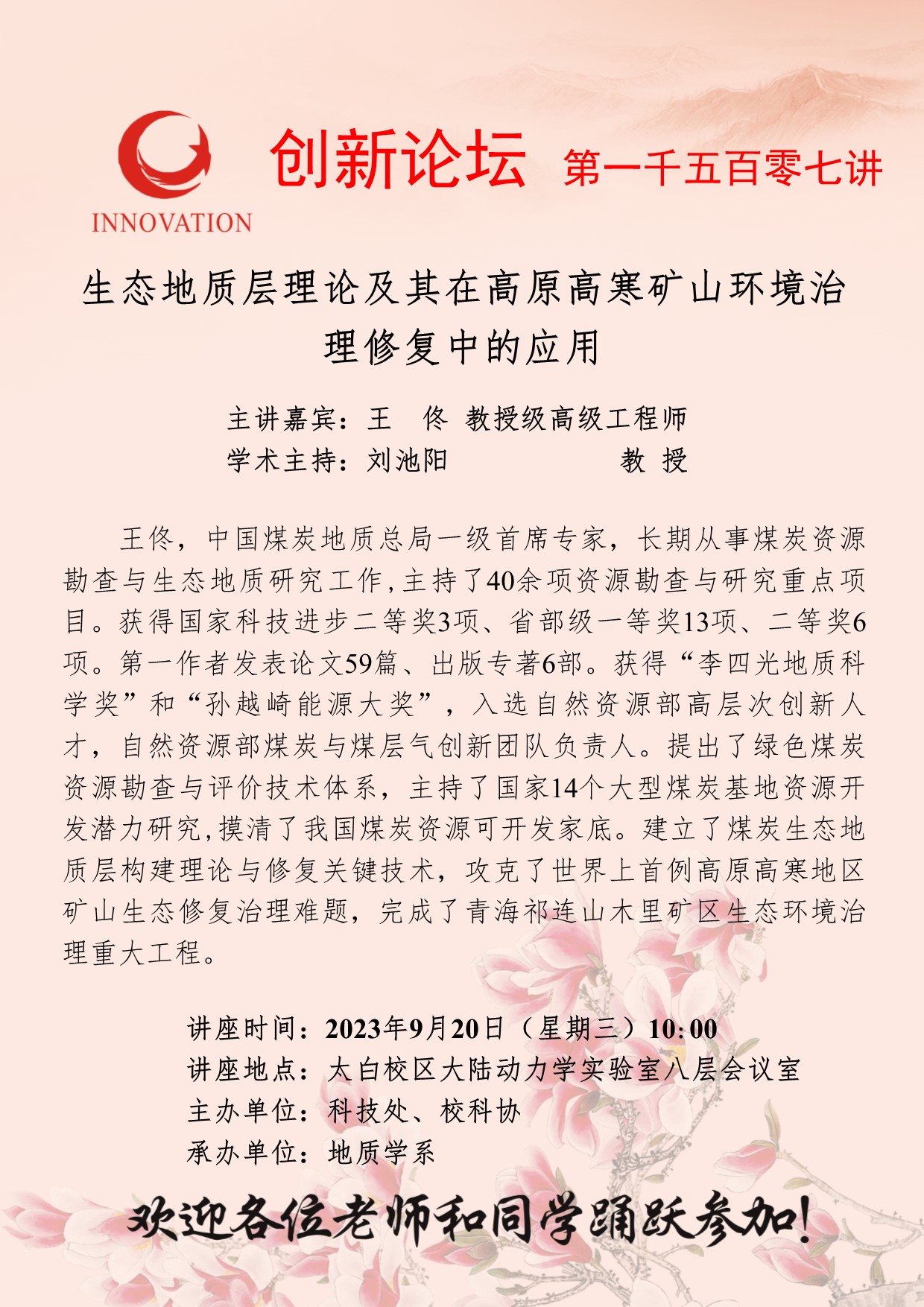 王佟 教授级高级工程师 星空app官网创新论坛第一千五百零七讲:生态地质层理论及其在高原高寒矿山环境治理修复中的应用 讲座时间 2023年9月20日(星期三)10:00 讲座地点 太白校区大陆动力学实验室八层会议室 讲座人介绍 王佟 教授级高级工程师 讲座内容