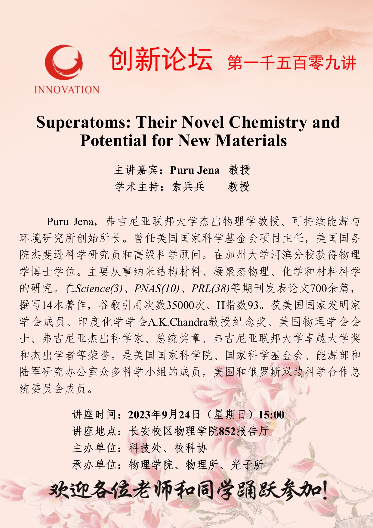 Puru Jena 教授 星空app官网创新论坛第一千五百零九讲:Superatoms: Their Novel Chemistry and Potential for New Materials 讲座时间 2023年9月24日(星期日)15:00 讲座地点 长安校区物理学院852报告厅 讲座人介绍 Puru Jena 教授 讲座内容