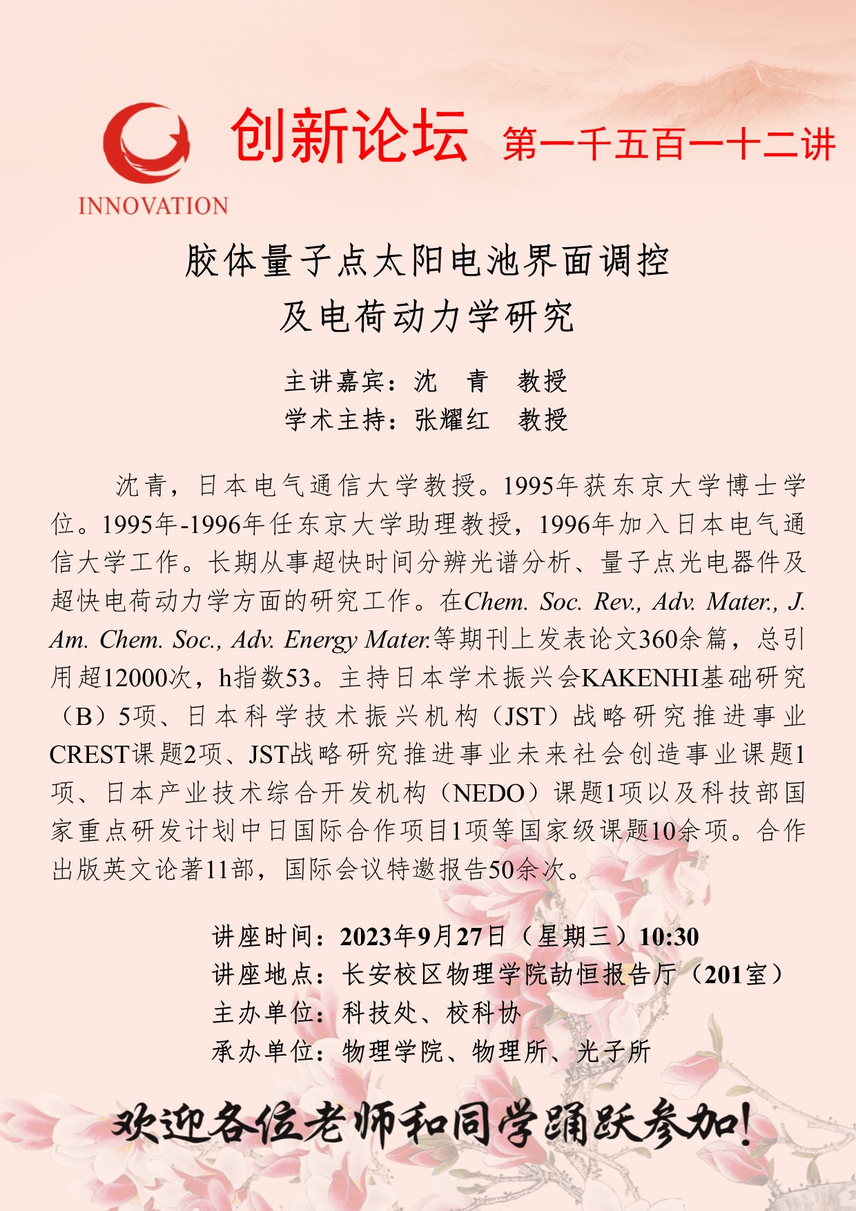沈青 教授 星空app官网创新论坛第一千五百一十二讲:胶体量子点太阳电池界面调控及电荷动力学研究 讲座时间 2023年9月27日(星期三)10:30 讲座地点 长安校区物理学院劼恒报告厅(201室) 讲座人介绍 沈青 教授 讲座内容