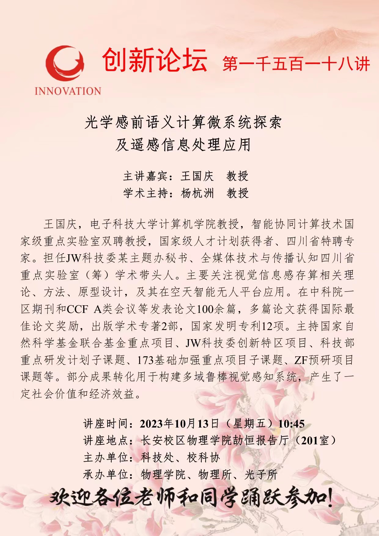 王国庆 教授 星空app官网创新论坛第一千五百一十八讲:光学感前语义计算微系统探索及遥感信息处理应用 讲座时间 2023年10月13日(星期五)10:45 讲座地点 长安校区物理学院劼恒报告厅(201室) 讲座人介绍 王国庆 教授 讲座内容