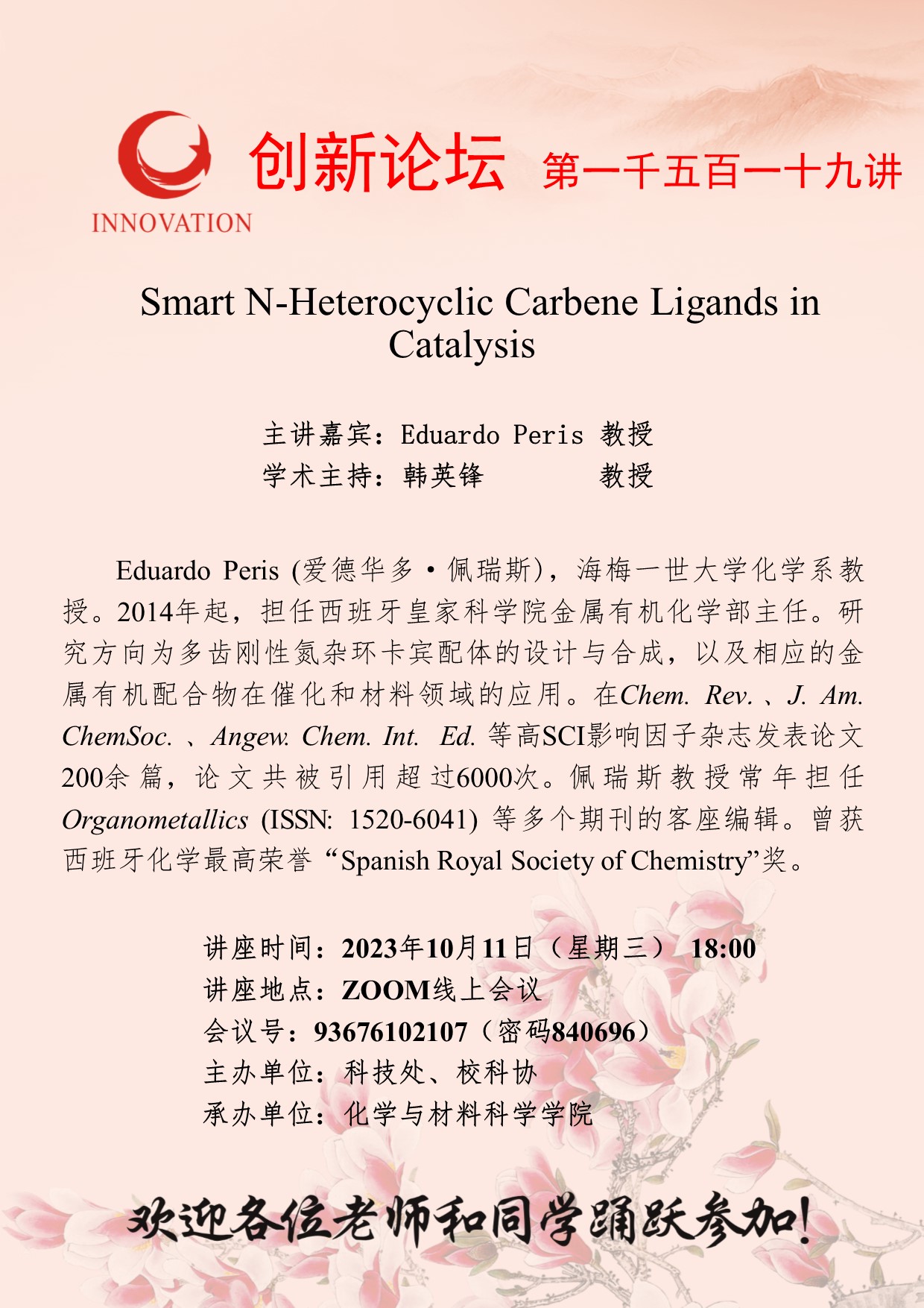 Eduardo Peris 教授 星空app官网创新论坛第一千五百一十九讲: Smart N-Heterocyclic Carbene Ligands in Catalysis 讲座时间 2023年10月11日(星期三) 18:00 讲座地点 ZOOM线上会议 讲座人介绍 Eduardo Peris 教授 讲座内容