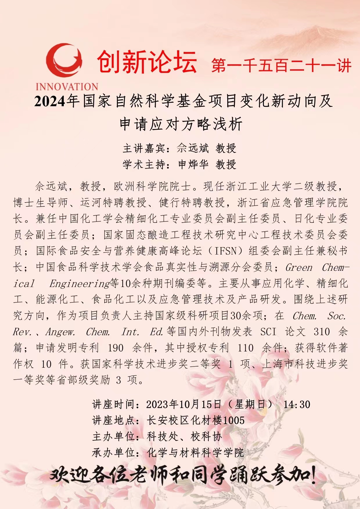 佘远斌 教授 星空app官网创新论坛第一千五百二十一讲: 2024年国家自然科学基金项目变化新动向及申请应对方略浅析 讲座时间 2023年10月15日(星期日) 14:30 讲座地点 长安校区化材楼1005 讲座人介绍 佘远斌 教授 讲座内容
