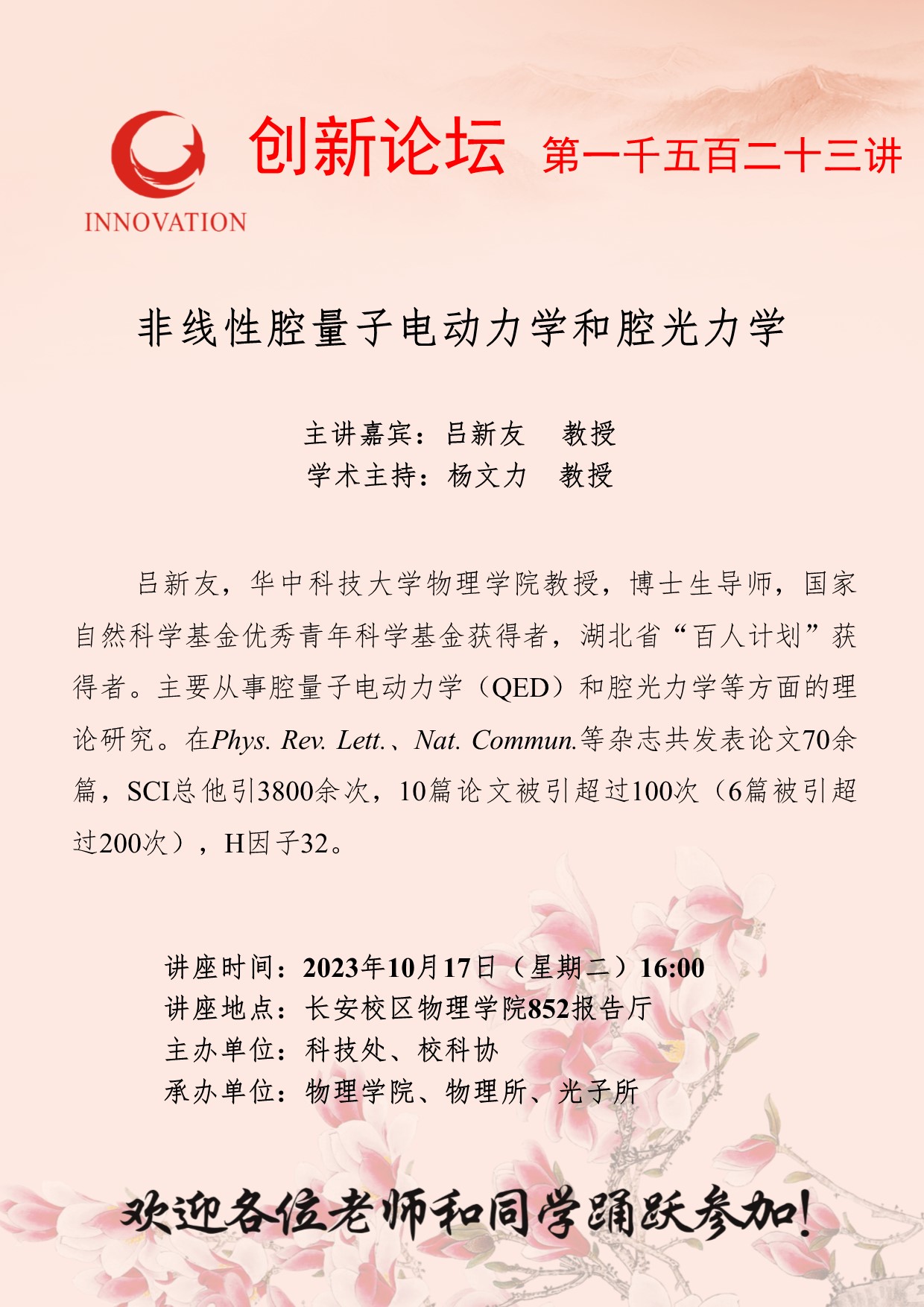 吕新友 教授 星空app官网创新论坛第一千五百二十三讲:非线性腔量子电动力学和腔光力学 讲座时间 2023年10月17日(星期二)16:00 讲座地点 长安校区物理学院852报告厅 讲座人介绍 吕新友 教授 讲座内容